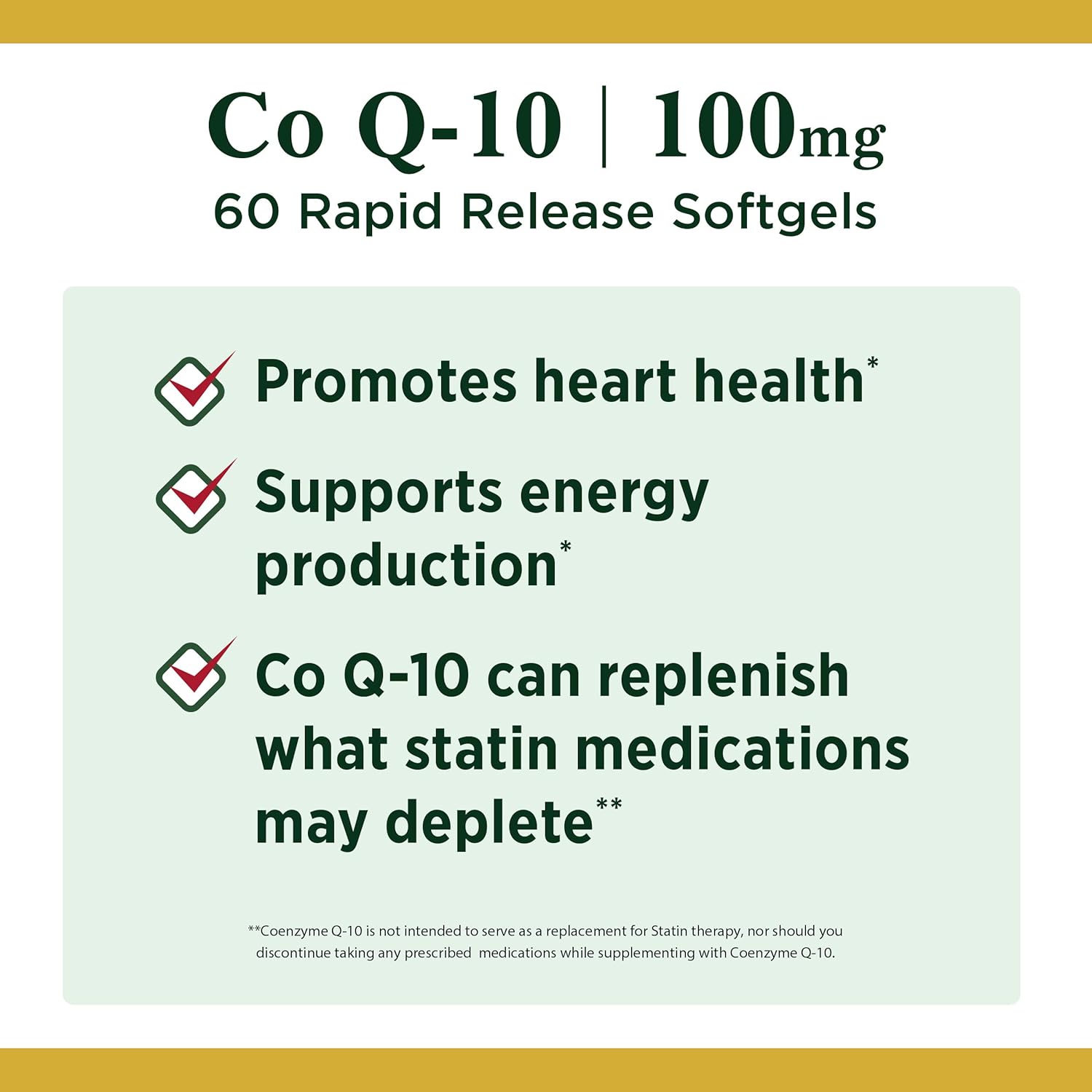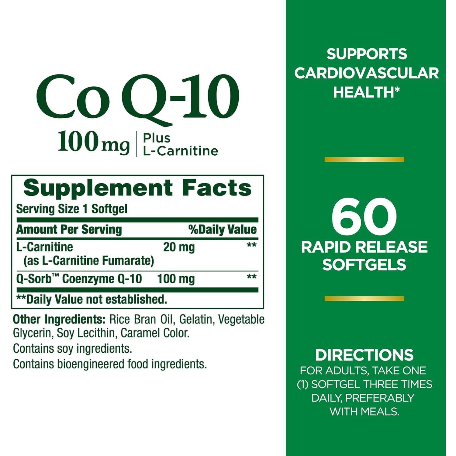 Product Description Coenzyme Q-10, 100mg Plus L-Carnitine Rapid Release Softgels by Nature's Bounty feature two ingredients, CoQ-10 and L-Carnitine that, together, provide potent antioxidant and cardiovascular support.(1) As an antioxidant, Q-Sorb' helps fight free radicals within the body.(1) Free radicals can cause oxidative stress which may contribute to the premature aging of cells.(1) They also support cellular energy production by helping the body convert food into energy. Additionally, for those who take statin medications, Nature's Bounty CoQ-10 supplements can replenish what statin medications may deplete.(2) Nature's Bounty CoQ-10 Plus L-Carnitine Softgels are non-GMO, free of sugar, gluten and lactose, and contain no artificial flavors or sweeteners. And because they're from the trusted vitamin and supplement experts at Nature's Bounty, these high-quality supplements are made with only the purest ingredients and are backed by nearly 50 years of science, innovation and expertise. \n(1)These statements have not been evaluated by the Food and Drug Administration. This product is not intended to diagnose, treat, cure or prevent any disease.\n(2)Coenzyme Q-10 is not intended to serve as a replacement for statin therapy, nor should you discontinue taking any prescribed medications while supplementing with Coenzyme Q-10. Amazon.com Co Q-10 plus Q-Sorb 100 mg 60 Softgels Co Q-10 plus Q-Sorb 100 mg Co Q-10 also plays a role in helping the body convert food to energy.* Rapid-release liquid softgels provide quick absorption and are easy to swallow. Nature's Bounty Co Q-10 Plus with L-carnitine heart-healthy softgels feature a synergistic blend of Co Q-10 and L-carnitine that provides powerful antioxidant and cardiovascular support.* Coenzyme Q-10 Coenzyme Q-10 (Co Q-10) is a powerful antioxidant that supports heart health and is essential for energy production.* It may be especially important for people taking statin drugs to take a Co Q-10 supplement, because statins can reduce Co Q-10 levels in the body. Specialty Supplements Specialty supplements are important for unique areas of your overall well-being.* Nature's Bounty offers a full line of high-quality specialty supplements to cover all of your nutritional needs.* Heart Health Your heart is the most important muscle in your body, and it's responsible for the pumping of nutrients. Taking Nature's Bounty heart health supplements along with regular exercise and a healthy diet can help keep your heart healthy and strong.* Nature's Bounty: Quality You Can Count On Health-conscious people have trusted Nature's Bounty for decades. Our dedication to quality, consistency, and scientific research has resulted in vitamins and nutritional supplements of unrivaled excellence. By combining the latest breakthroughs in nutritional science with the finest ingredients, Nature's Bounty is proud to provide you with supplements of unsurpassed quality and value. Nature's Bounty supplements are overseen by scientists, manufacturing specialists, and quality experts, each one dedicated to maintaining the highest quality standards. As part of a commitment to quality, Nature's Bounty only uses ingredients from suppliers that meet stringent Quality Assurance Standards, as well as GMP food quality standards. Every Nature's Bounty product is subjected to numerous quality tests and assays throughout the manufacturing process to verify purity and full potency. What's in the Box Nature's Bounty Co Q-10 plus Q-Sorb 100 mg (60 Softgels). *These statements have not been evaluated by the Food and Drug Administration. This product is not intended to diagnose, treat, cure, or prevent any disease. ◊ Note: Coenzyme Q-10 is not intended to serve as a replacement for Statin therapy, nor should you discontinue taking any prescribed medications while supplementing with Coenzyme Q-10.