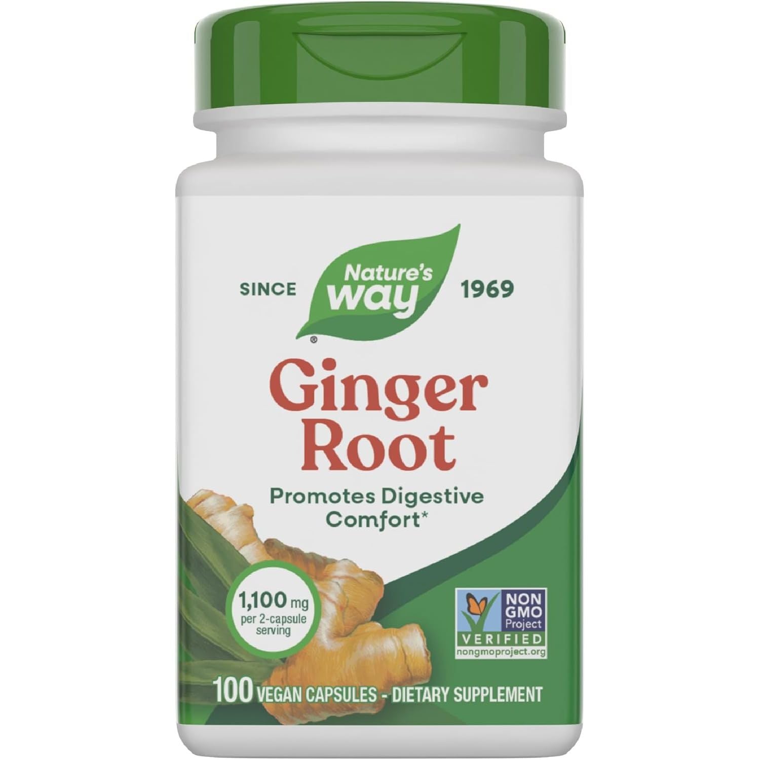 - Nature's Way Ginger Root is a ginger supplement that contains 1,100 mg per 2-capsule serving promoting digestive comfort.* The root is clinically studied to reduce nausea due to motion*