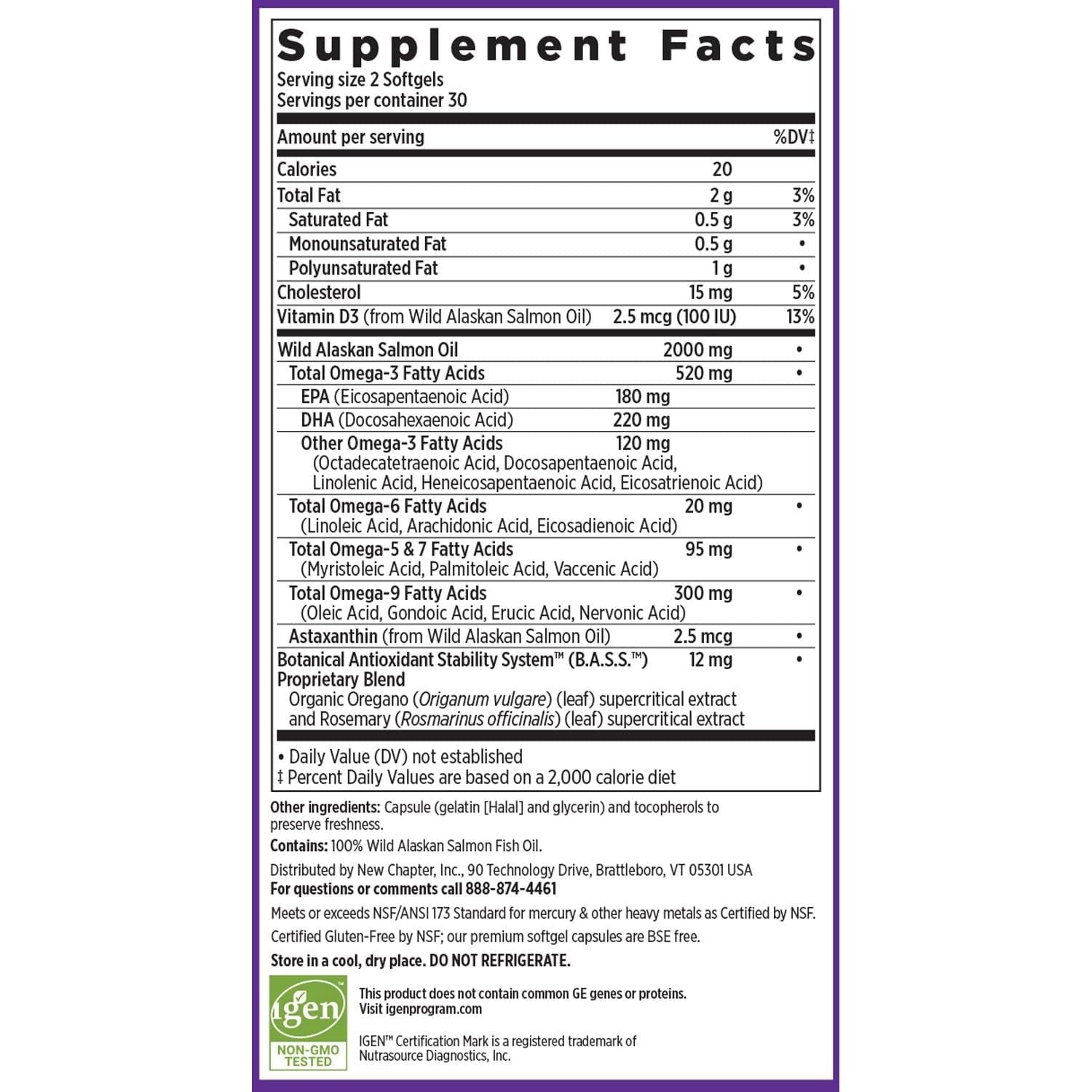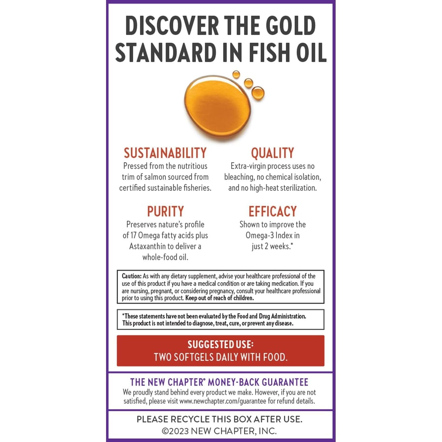 New Chapter brings you the gold standard in fish oil. Wholemega Fish Oil Supplements have been clinically shown to improve the Omega-3 Index in just 2 weeks.* Each 2000 mg dose (2 softgels) of whole-food salmon oil is fresh-pressed to deliver 17 Omega fatty acids (including vital Omega-3s DHA & EPA) for better absorption, plus naturally occurring Vitamin D3. Uses only 100% wild Alaskan salmon oil and helps avoid food waste by using upcycled salmon trim. No krill oil, no anchovies or sardines, no cod liver oil, no exploited fisheries, no farmed fish. *These statements have not been evaluated by the Food and Drug Administration. This product is not intended to diagnose, treat, cure, or prevent any disease.