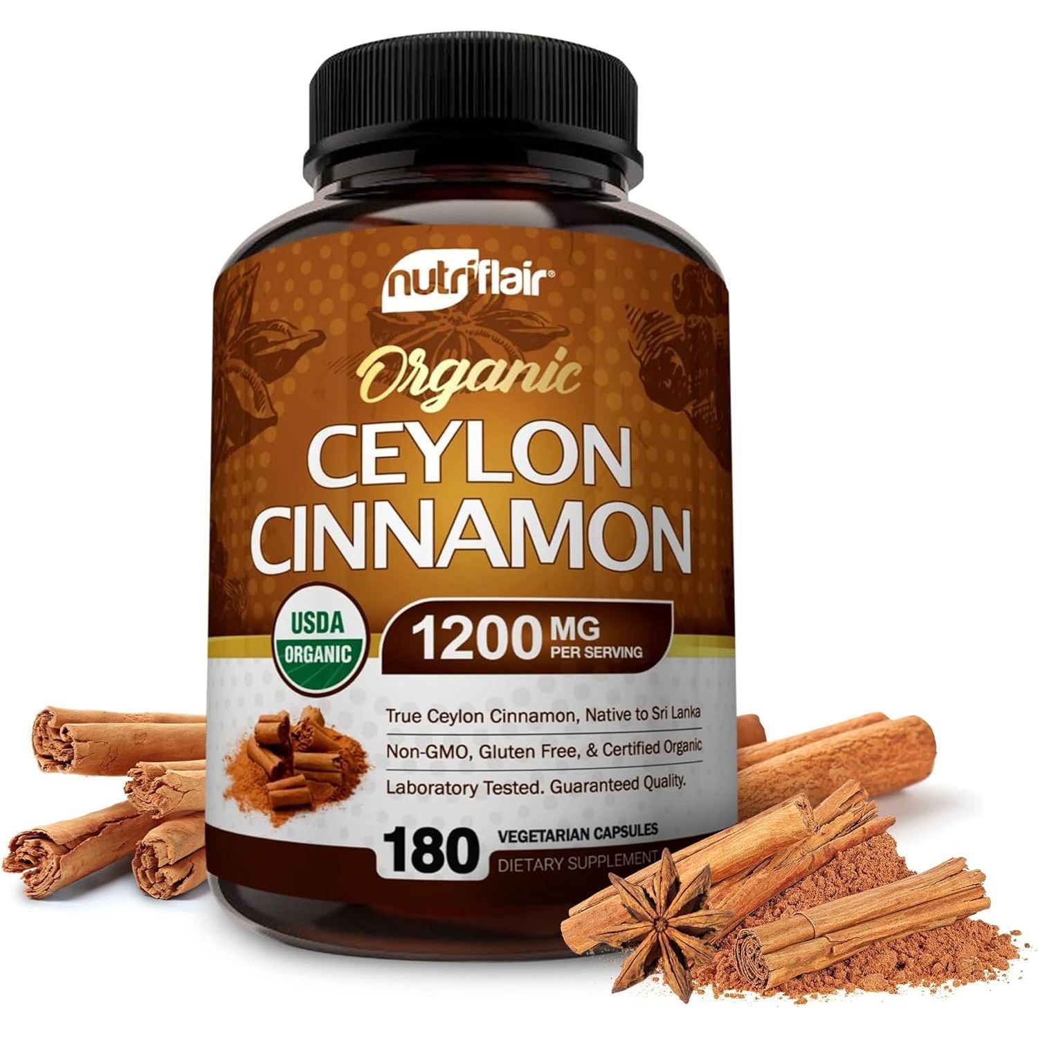 - NutriFlair Organic Ceylon Cinnamon Supplement 1200mg, 120 Capsules - USDA Certified - Non-GMO, Gluten Free Powder, Antioxidant Pills