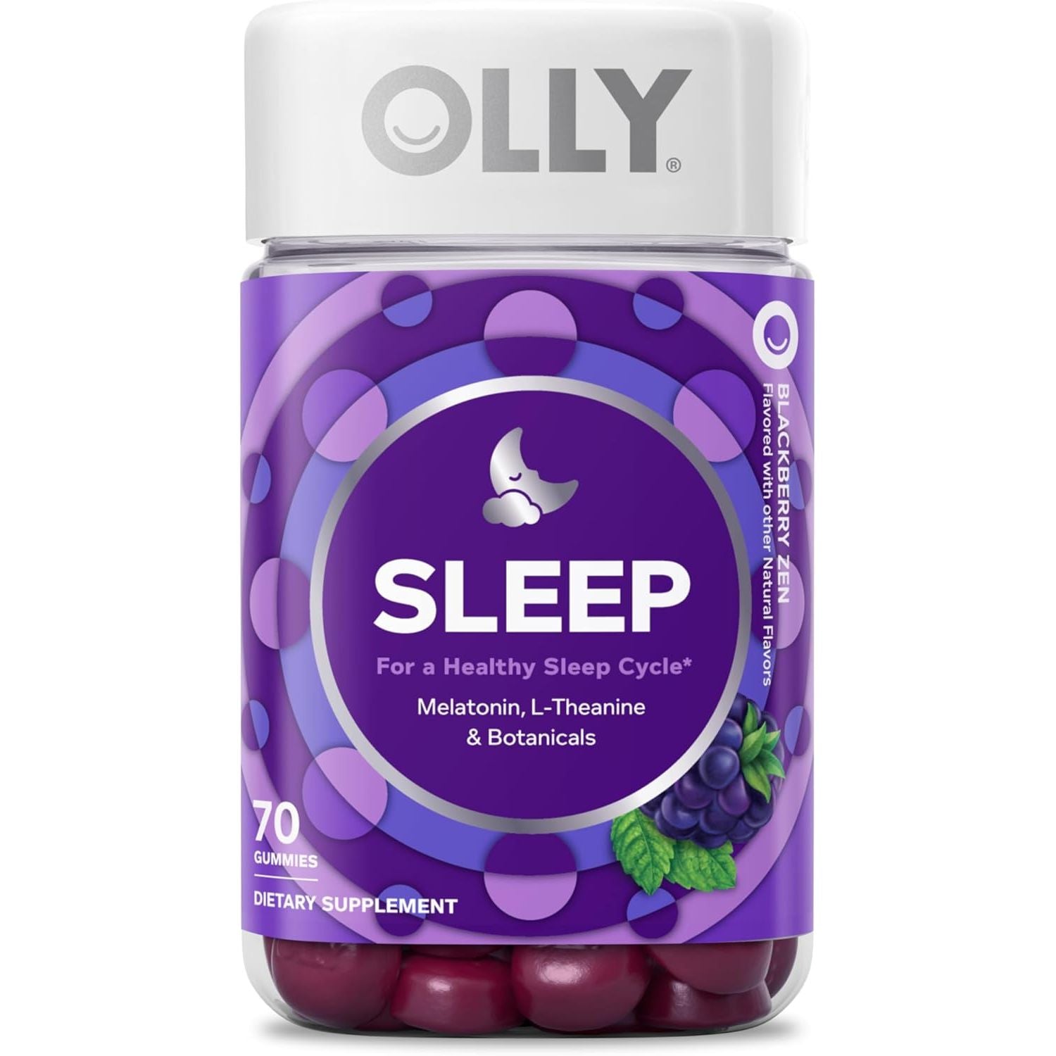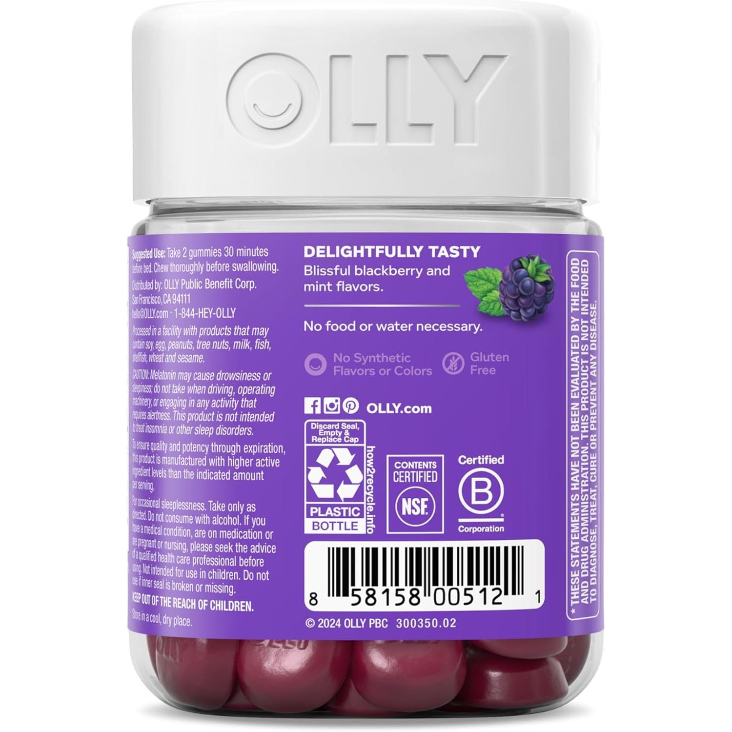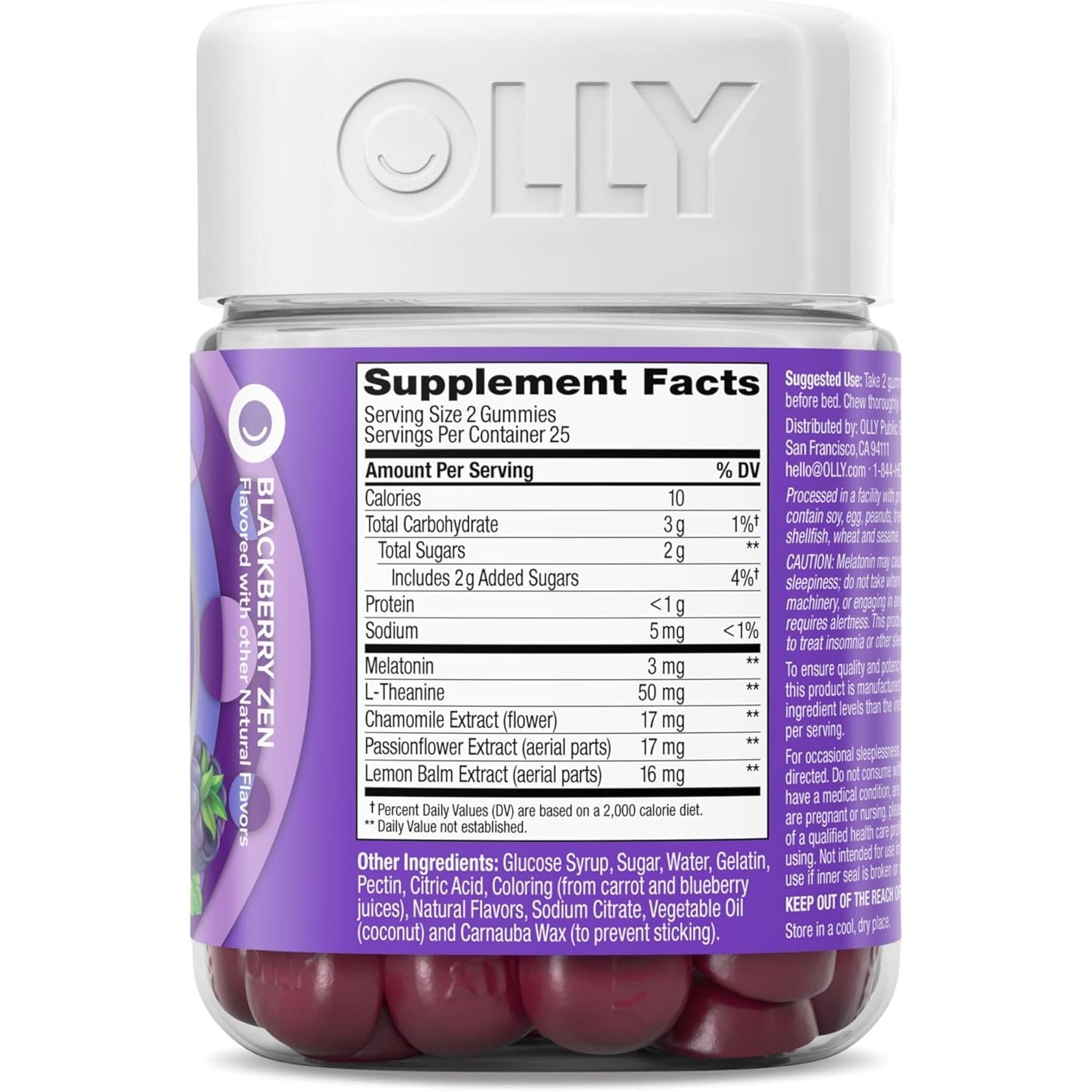 - OLLY Restful Sleep Gummy Supplement with Melatonin & L-Theanine Chamomile, Blackberry Zen, 50 Gummies (25 Day Supply) Supports a Healthy Sleep Cycle* (Packaging May Vary)
