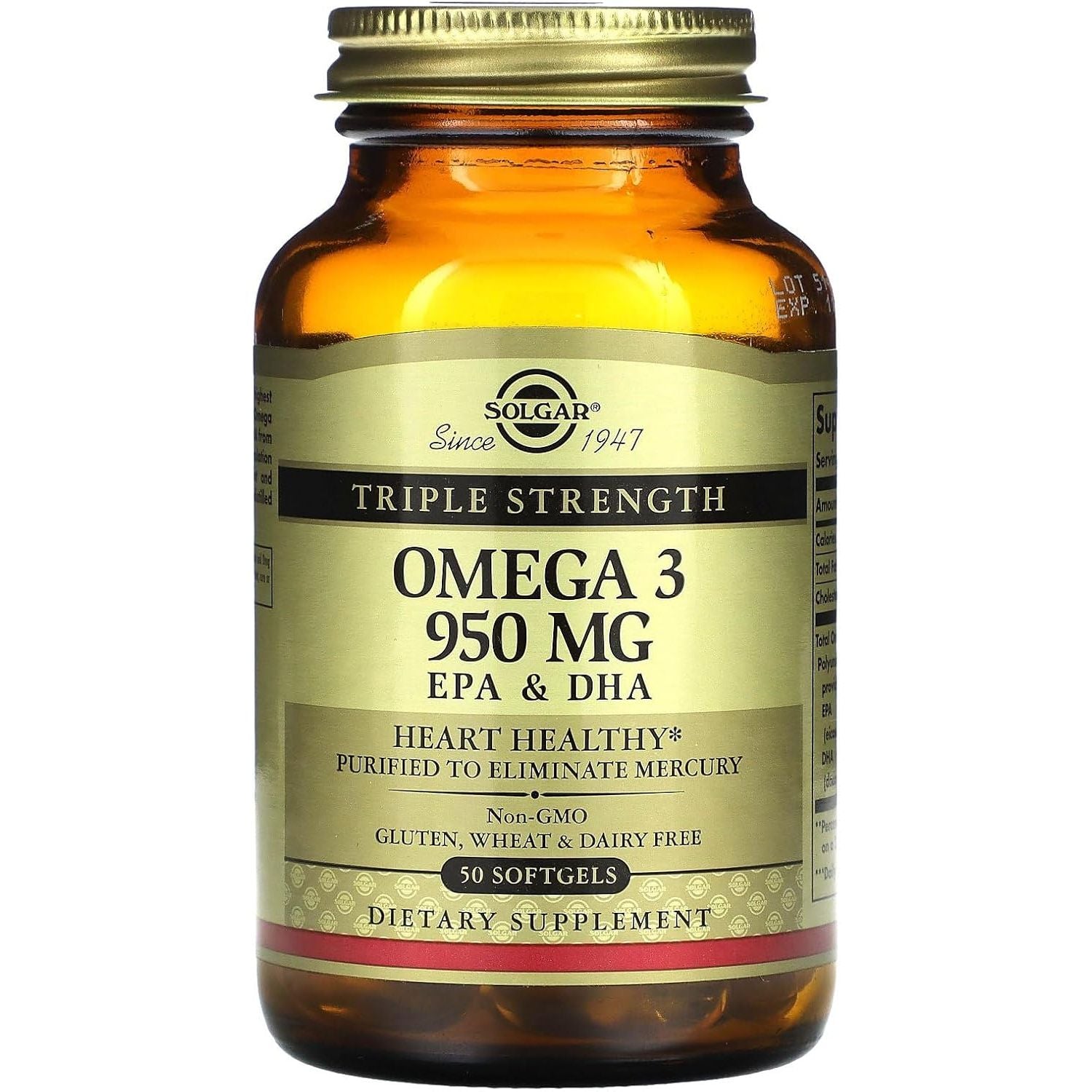 - Optimum Purity; Sourced from deep-sea, cold water fish, Solgar Triple Strength Omega 3 950 mg is purified via molecular distillation to remove mercury and other environmental impurities