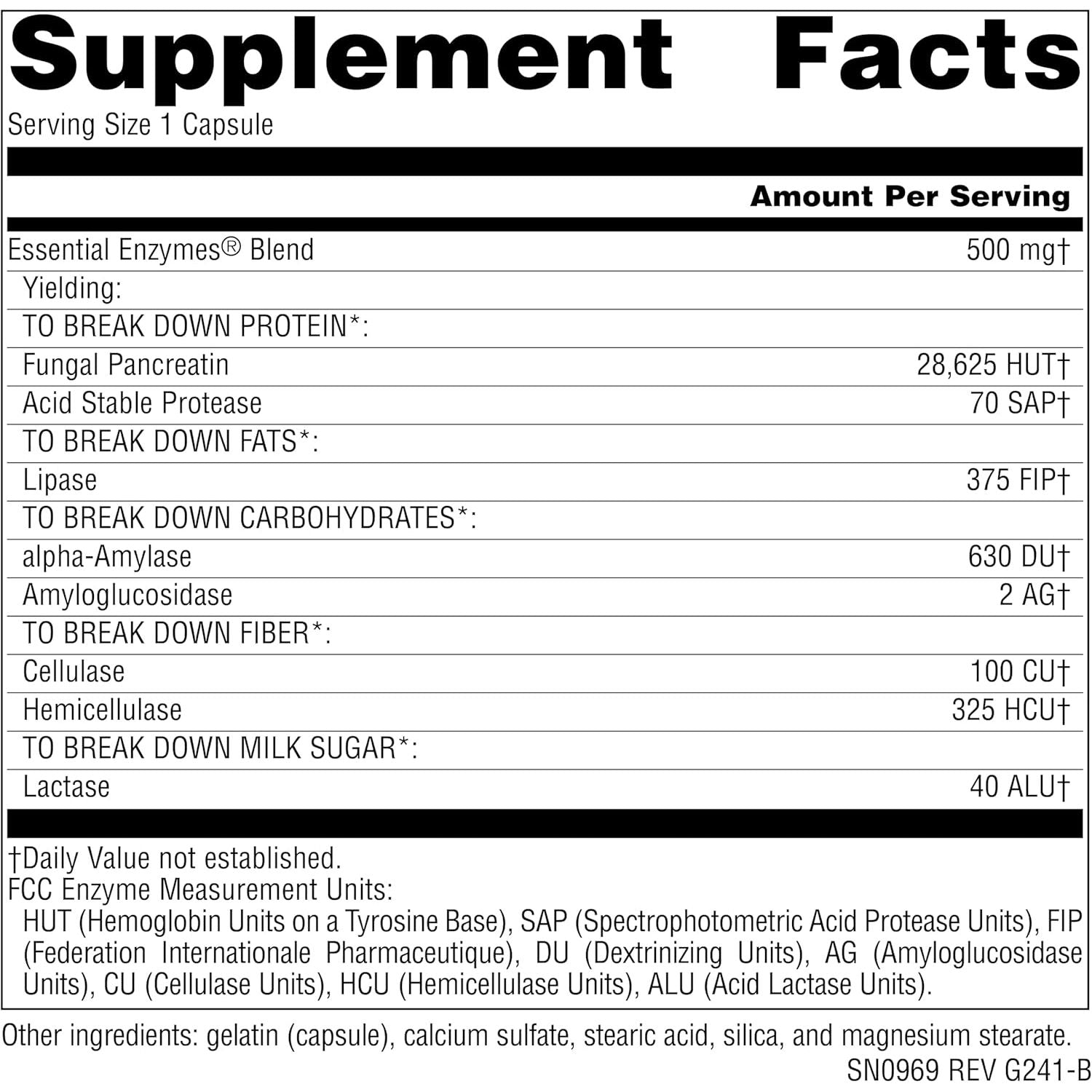 As we age, hydrochloric acid and digestive enzyme secretion may both decline. Add to that the many additional factors poor eating habits, inadequate chewing, “eating on the run,” and over-consumption of alcohol that put stress on the digestive process. Essential Enzyme is a Bio-Aligned Formula that contains a wide array of enzymes that break down proteins, fats, milk sugar, fiber, and carbohydrates in a wide pH range.*