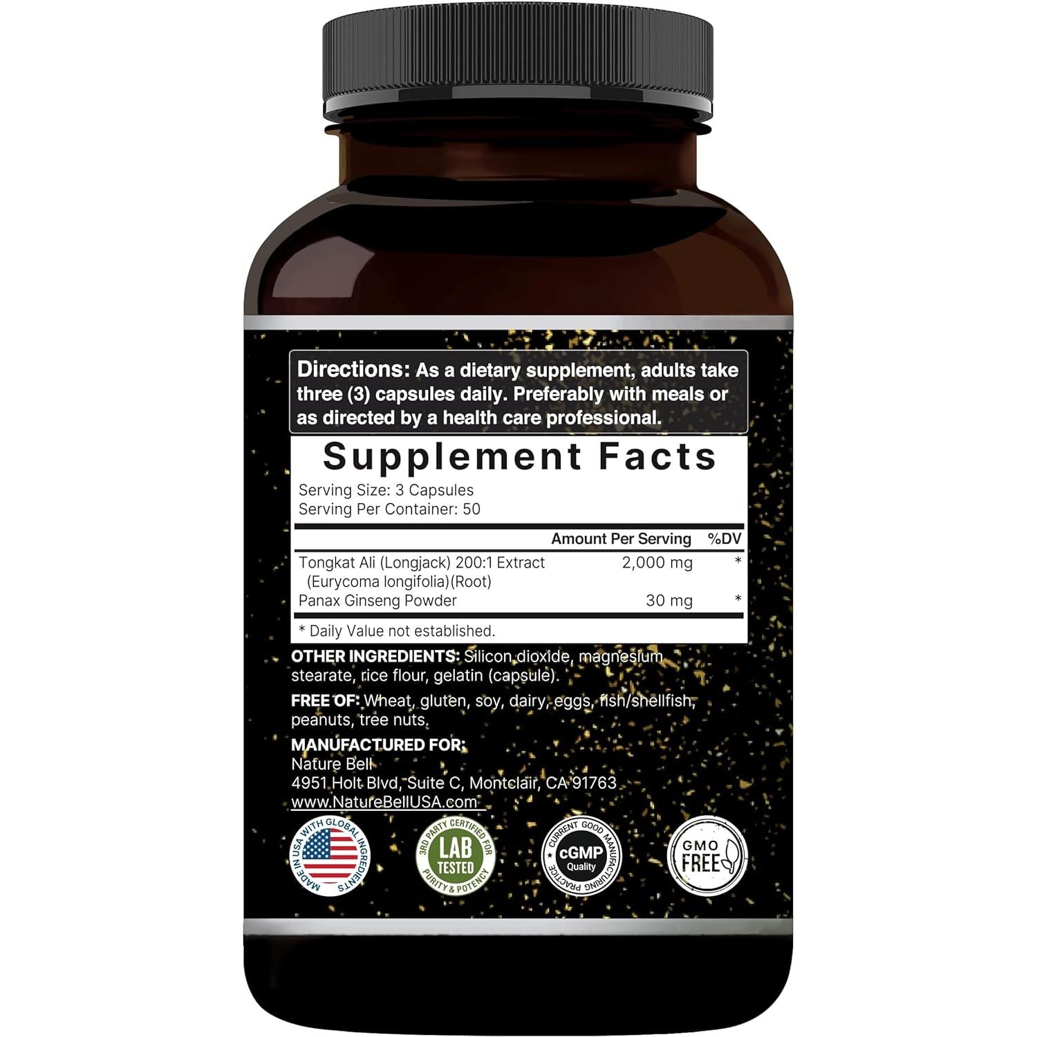 - 2,000mg tongkat with 30mg panax ginseng per 3 capsule serving size, 150 capsules per bottle, 50-day supply.