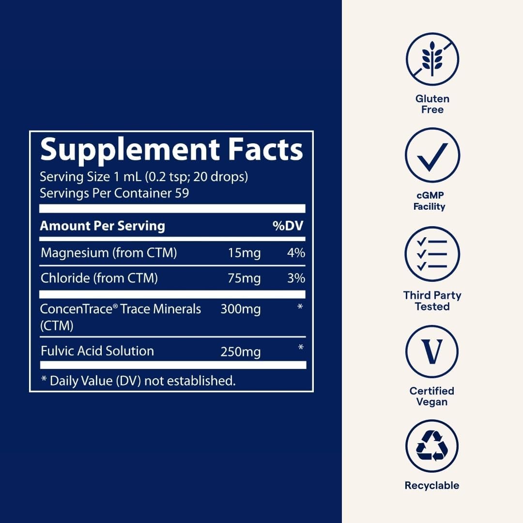 Trace mineral research ionic fulvic acid is a rich, concentrated liquid dietary supplement that provides 250 mg of fulvic acid per serving, plus over 72 naturally occurring ionic trace minerals from concentrace, america's no. 1 selling trace mineral supplement according to spins data. Fulvic acid may help support and maintain healthy functions in the body, including the following: digestion, PH balance, energy production, hydration, cellular integrity, enzyme activity, muscle endurance and stamina. Each bottle comes with a metered dropper which allows for variable dosing. Health care providers recommend different doses, depending on your needs. The metered dropper allows for these recommendations to be followed, where a normal tablet or capsule does not.