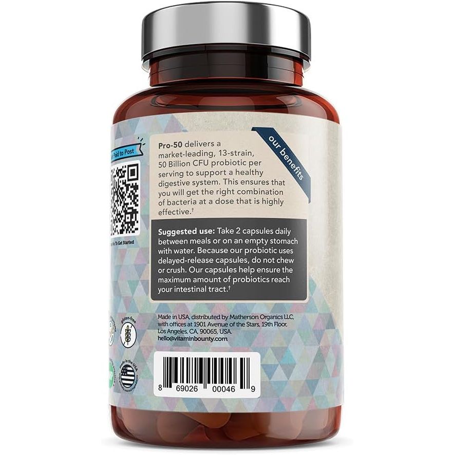 - Vitamin Bounty Pro-50 Probiotics 50 Billion CFU for Women & Men - 13 Multi Strain Probiotic + Prebiotic - Digestive Health Supplements for Gut Health Support - Delayed Release Capsules for Men & Women