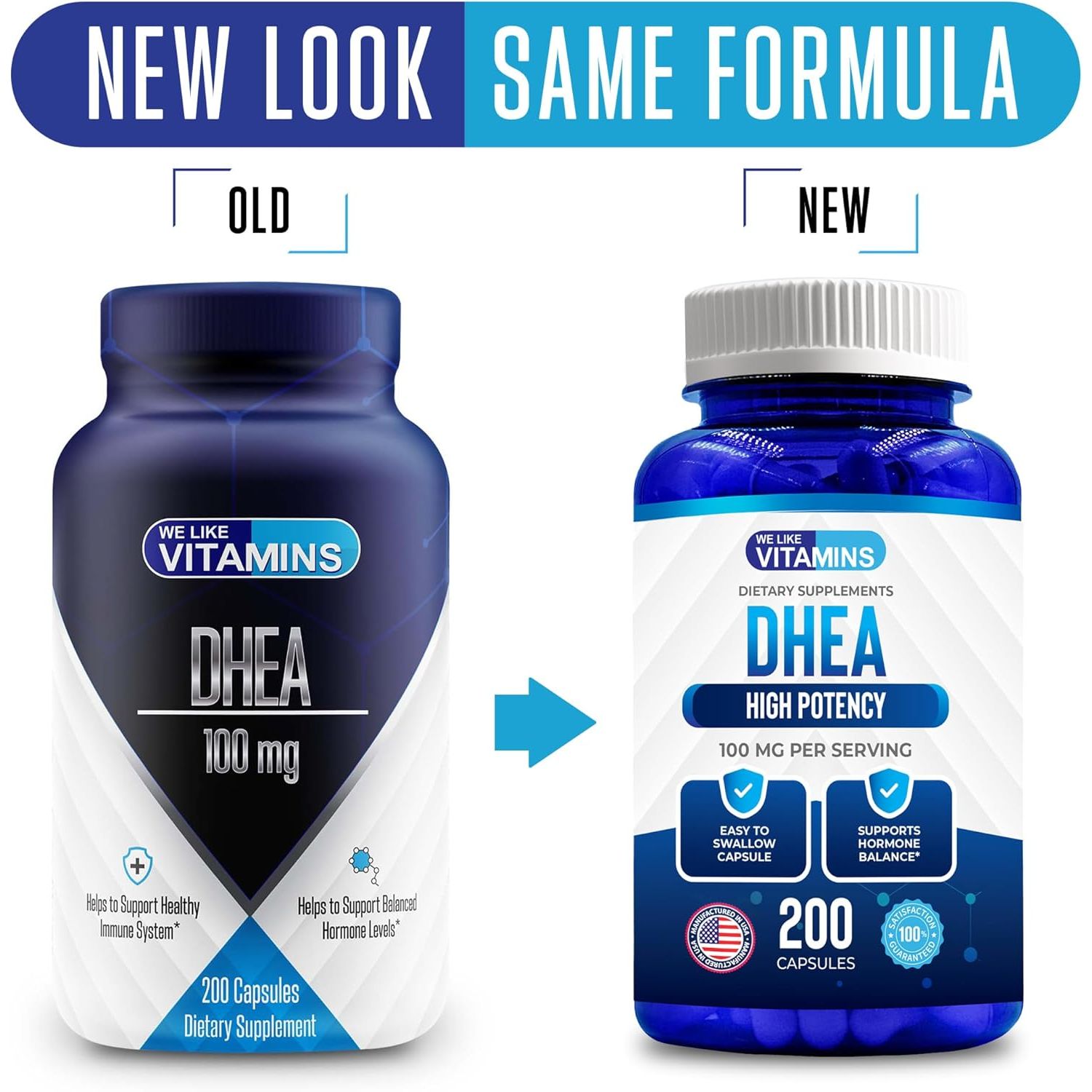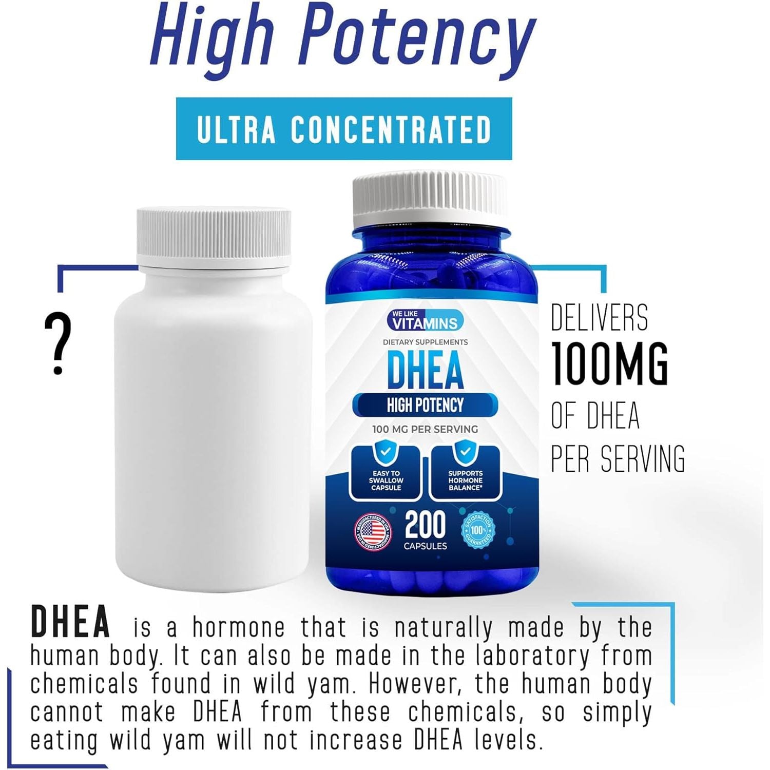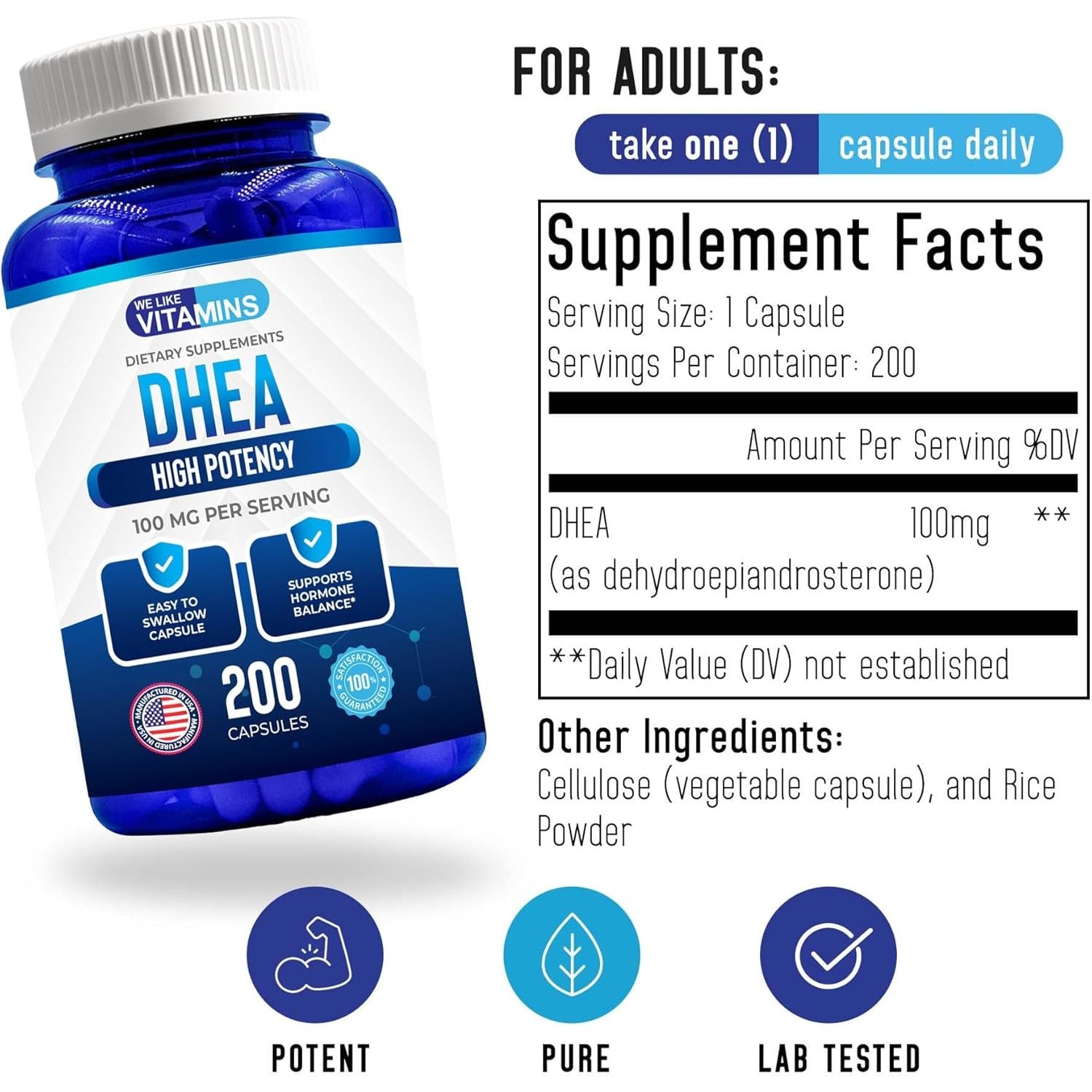 - We Like Vitamins DHEA 100mg 200 Capsules - 200 Day Supply of DHEA Capsules - Helps with Hormone Balance and Energy Levels for Men & Women
