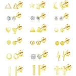 You can get 18 pairs of stainless steel barbell stud earrings with one order.There are Cubic Zirconia cartilage stud earrings, heart, triangle, moon, ball, frosted, cross, lightning, circle Geometric screwback earrings, etc.