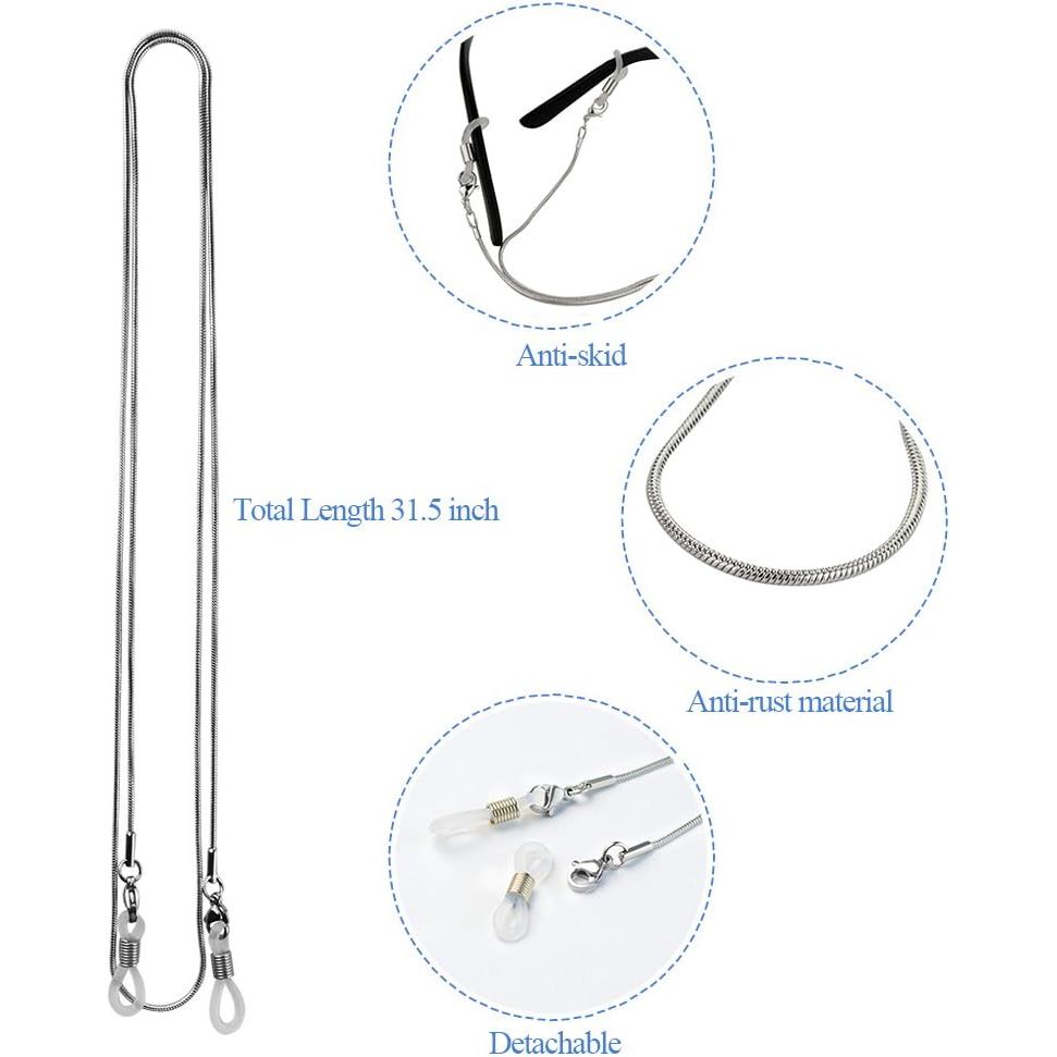 - ENOUGH SIZE FOR WEARIBN AROUND NECK: The size is 31.5 inch (80cm) in length, 0.12cm diameter; Color: Silver chain; it can help you hang glasses around your neck whenever and wherever you need them. Never worry about losing your glasses or no suitable placement.