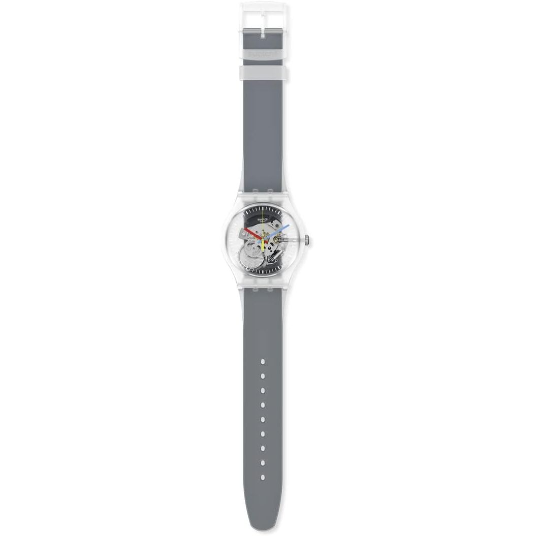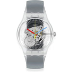 This transparent watch features a clear plastic case with a black back print and a matching silicone strap. The clear dial is printed with white indexes and pops with red, blue and yellow hands.