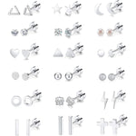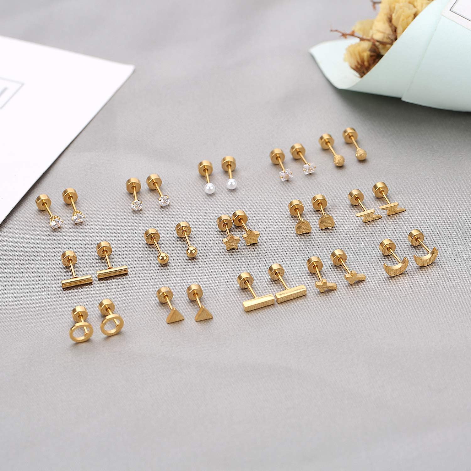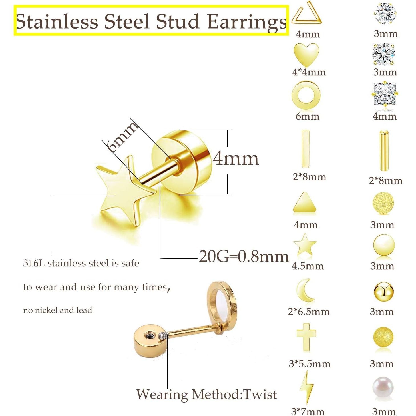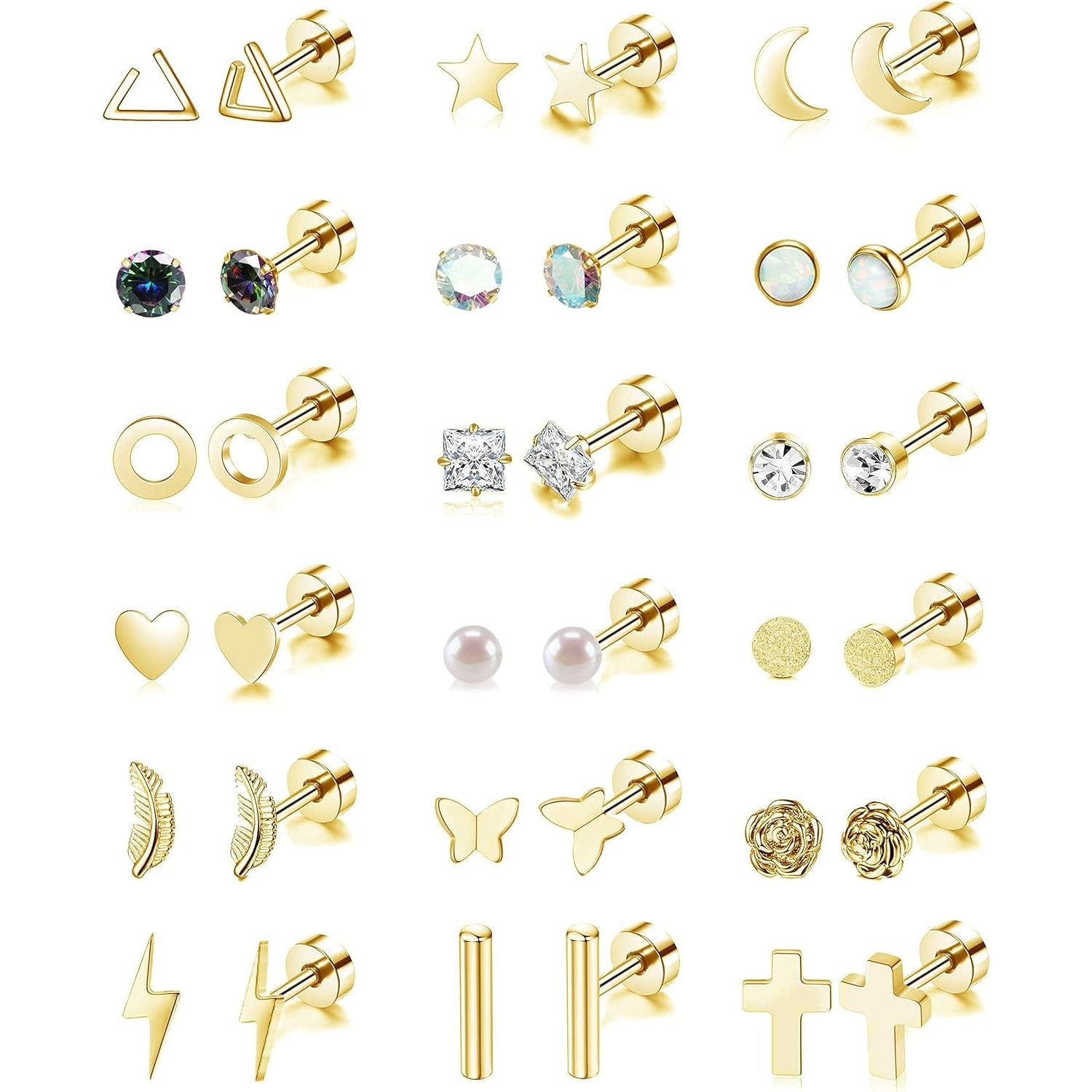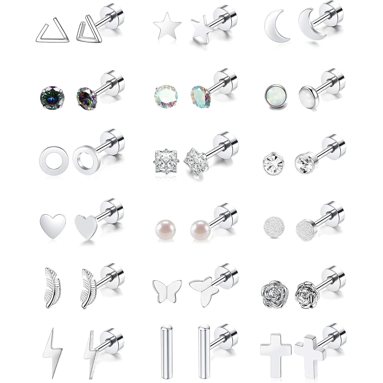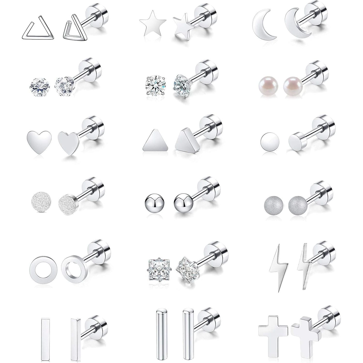 You can get 18 pairs of stainless steel barbell stud earrings with one order.There are Cubic Zirconia cartilage stud earrings, heart, triangle, moon, ball, frosted, cross, lightning, circle Geometric screwback earrings, etc.