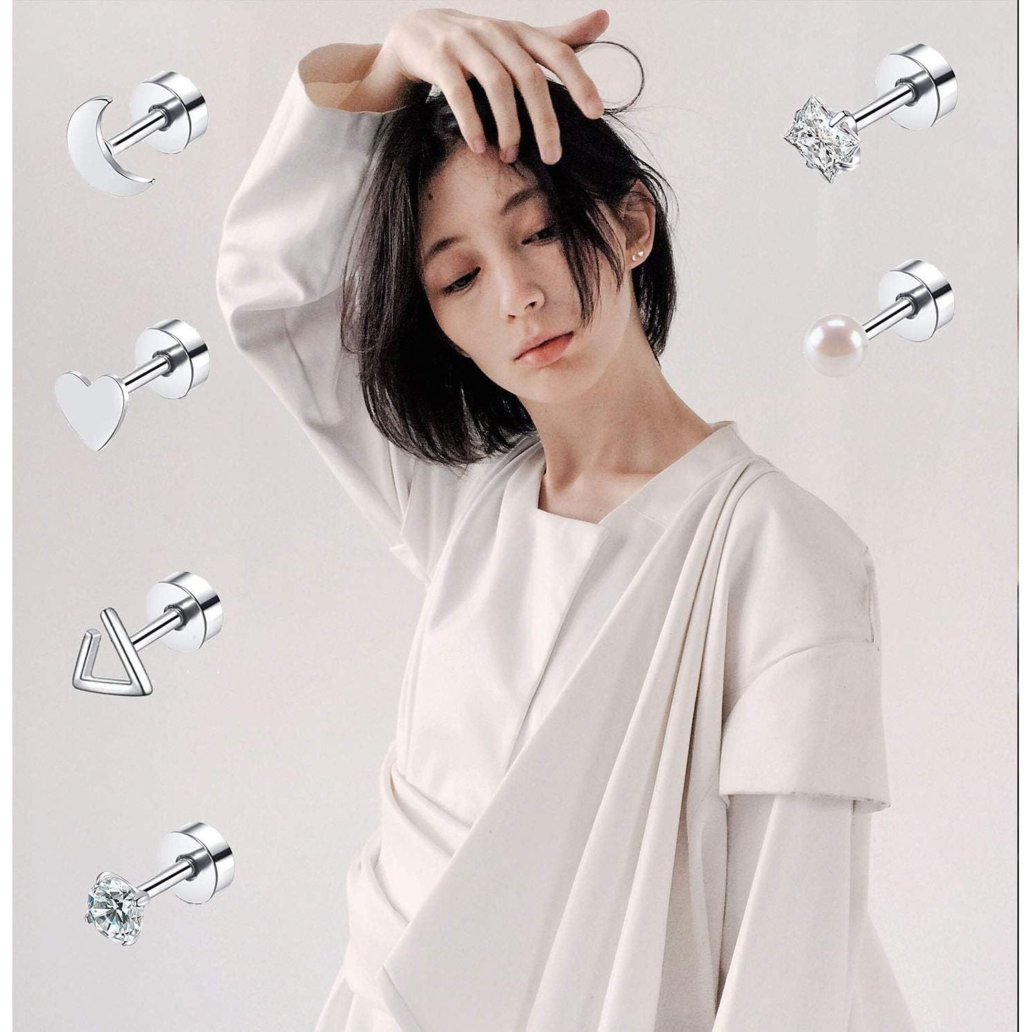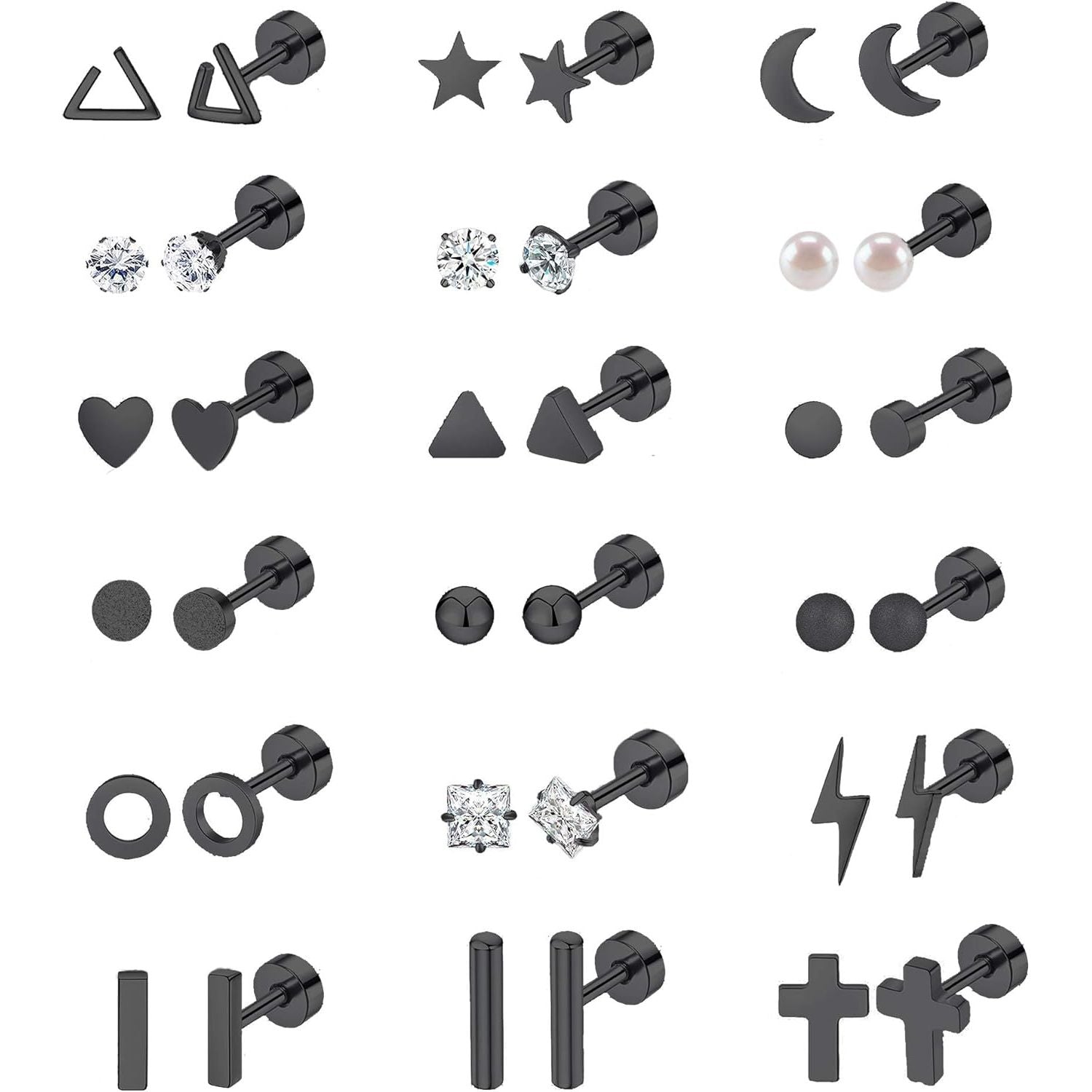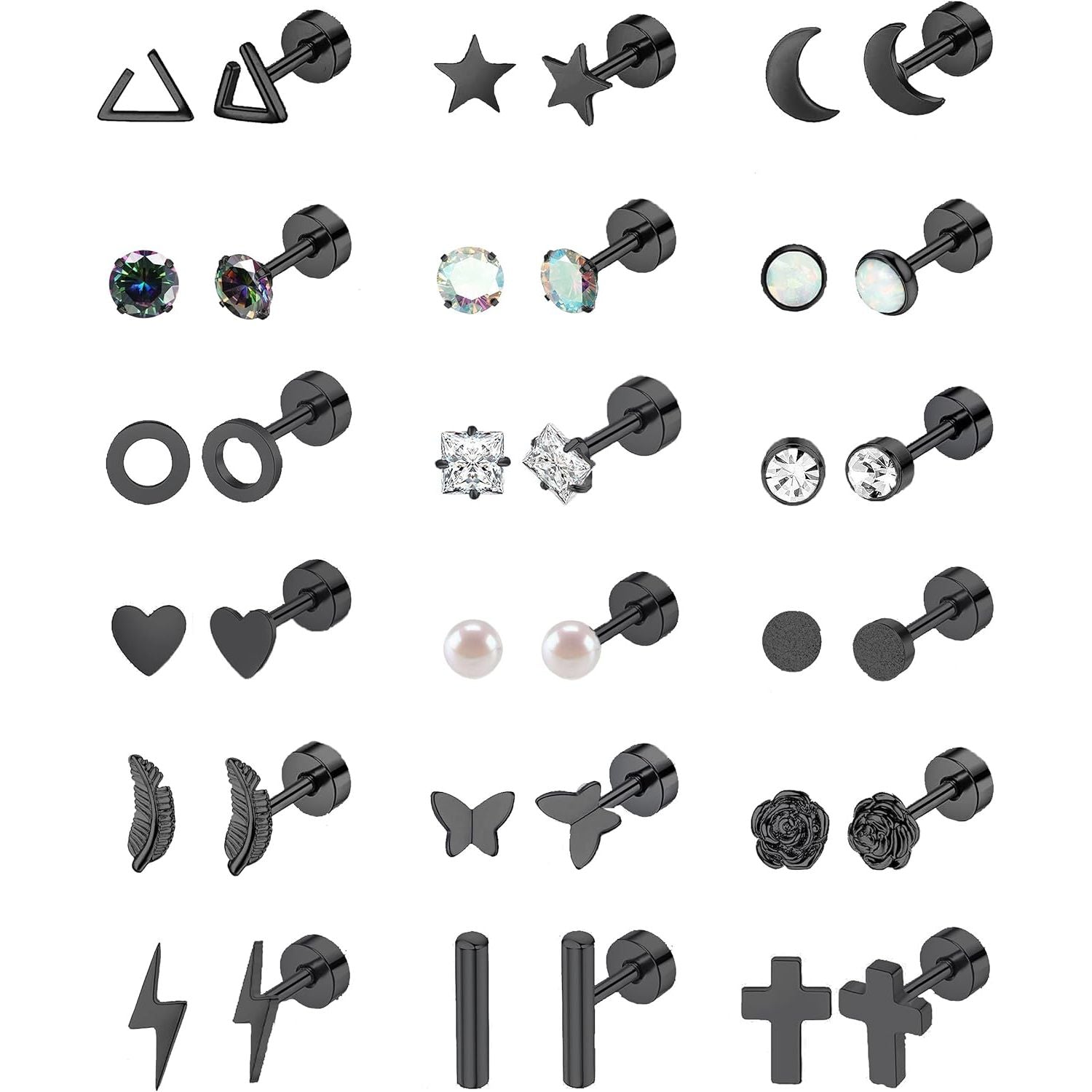You can get 18 pairs of stainless steel barbell stud earrings with one order.There are Cubic Zirconia cartilage stud earrings, heart, triangle, moon, ball, frosted, cross, lightning, circle Geometric screwback earrings, etc.