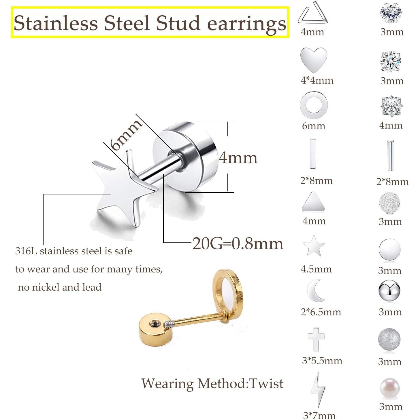 - Everyday Earrings That Can Never Go Wrong—Build the ear stack of your dreams with our Staligue Flat Back Earrings. Featuring 18 different flat back stud earrings, this stainless steel earrings set has everything from heart, triangle, moon, ball, frosted, cross,etc. Our flatback stud earrings was curated by our talented jewelry designers, so it takes the guesswork out of building a cohesive stack all from scratch.