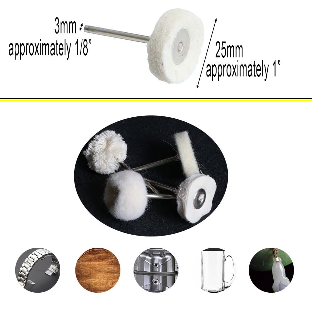 - 1Inch Polishing Buffing Wheel Set,Wool Felt Cotton Mounted 3mm Shank for Rotary Tool Accessories,Mini Brush Polishing Kit for Watch and Jewelry 50 Pieces