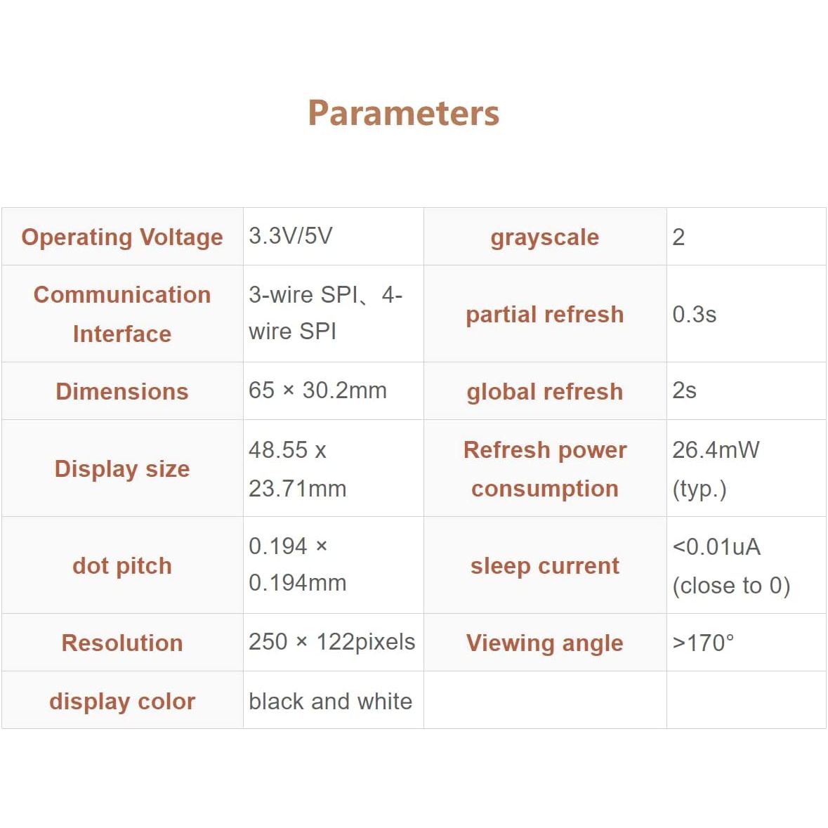 250x122, 2.13inch E-Ink display HAT V4 Version for Raspberry Pi,Jetson Nano,SPI interface Overview This is an E-Ink display HAT V4 Version for Raspberry Pi,Jetson Nano, 2.13inch, 250x122 resolution, with embedded controller, communicating via SPI interface, supports partial refresh. Due to the advantages like ultra low power consumption, wide viewing angle, clear display without electricity, it is an ideal choice for applications such as shelf label, industrial instrument, and so on. Specifications Operating voltage: 3.3V/5V Interface: SPI Outline dimension: 65mm × 30.2mm Display size: 23.71mm × 48.55mm Dot pitch: 0.194 × 0.194 Resolution: 250 × 122 Display color: black, white Grey level: 2 Partial refresh time: 0.3s Full refresh time: 2s Refresh power: 26.4mW(typ.) Standby power: <0.017mW Viewing angle: >170° Interface VCC---3.3V GND---GND DIN---SPI MOSI CLK---SPI SCK CS---SPI chip select (Low active) DC---Data/Command control pin (High for data, and low for command) RST---External reset pin (Low for reset) BUSY---Busy state output pin (Low for busy) Package Content 2.13inch e-Paper HAT x1 RPi screws pack (2pcs) x1 PH2.0 20cm 8Pin x1 Note: Online development resources are provided ,please contact us to get if needed!