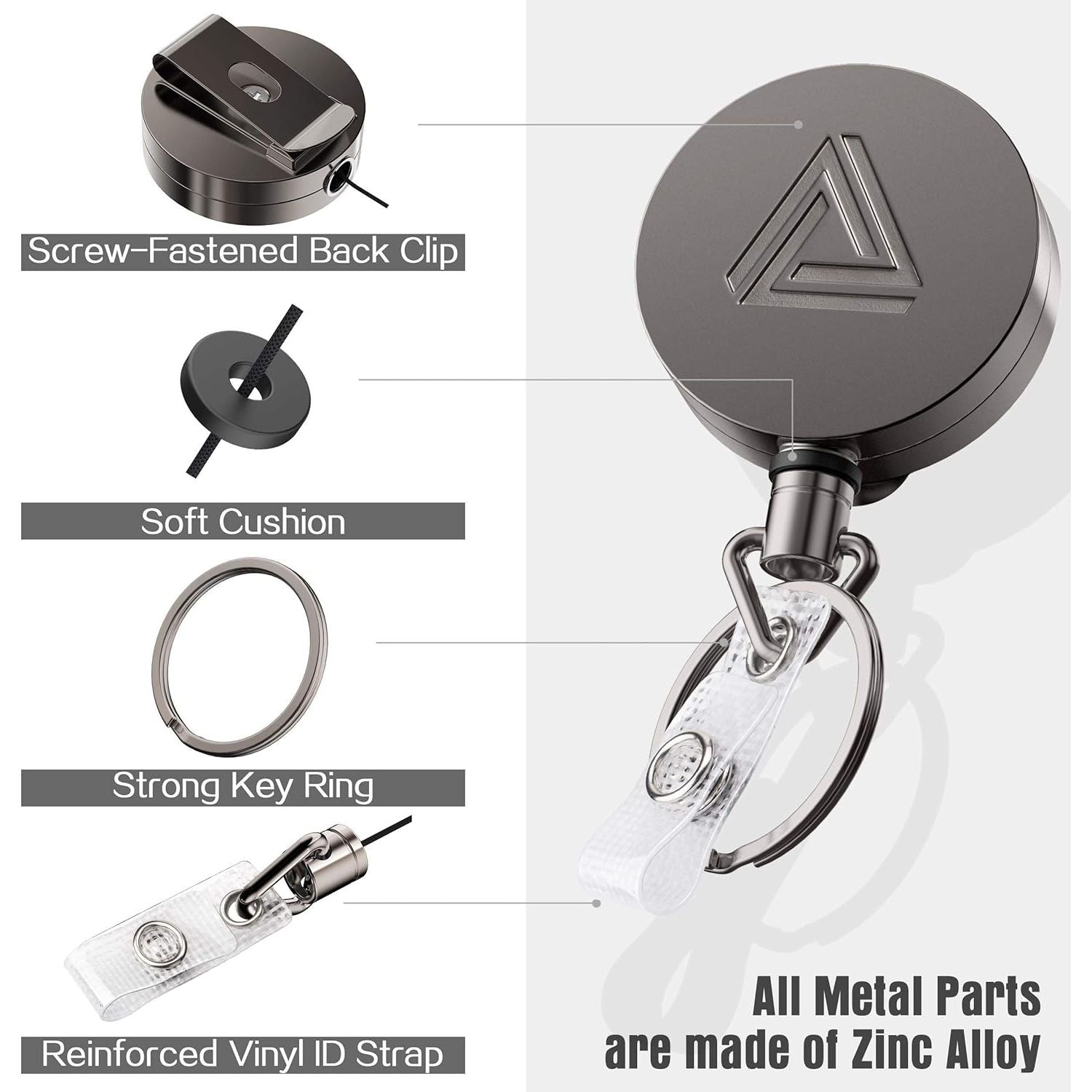 • [DURABLE RETRACTABLE BADGE HOLDER] - The heavy-duty badge reel is encased in a metallic color casing made of military grade zinc alloy metal. This strong casing provides support and protection to increase the longevity (over 100,000 pulls).