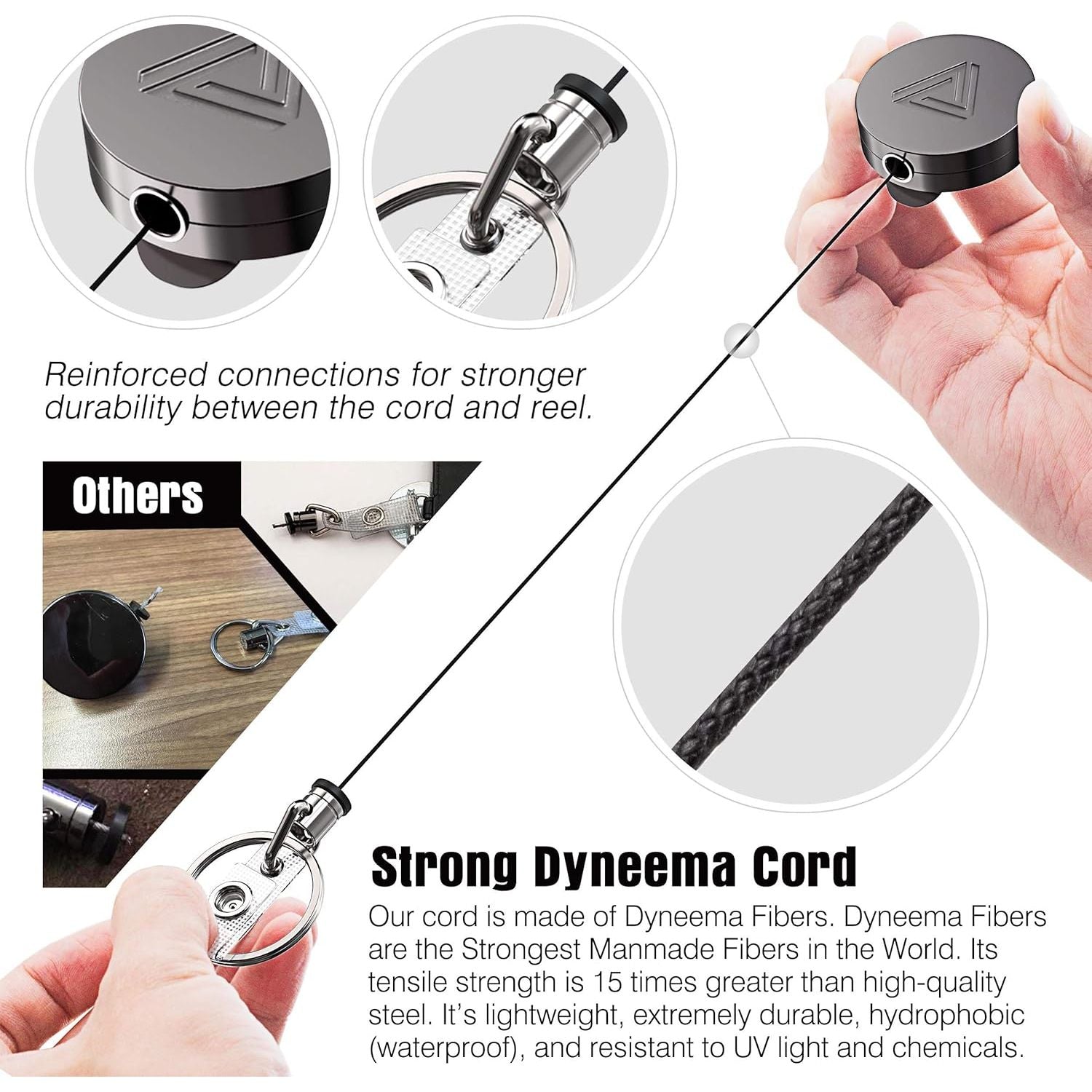 • [STRONG DYNEEMA CORD] - Our retractable badge holder is made from Dyneema fibers which creates a cord that is 15 times stronger than most high-quality steel cords. It's extremely lightweight and durable. This retractable keychain extends up to 30 inches.