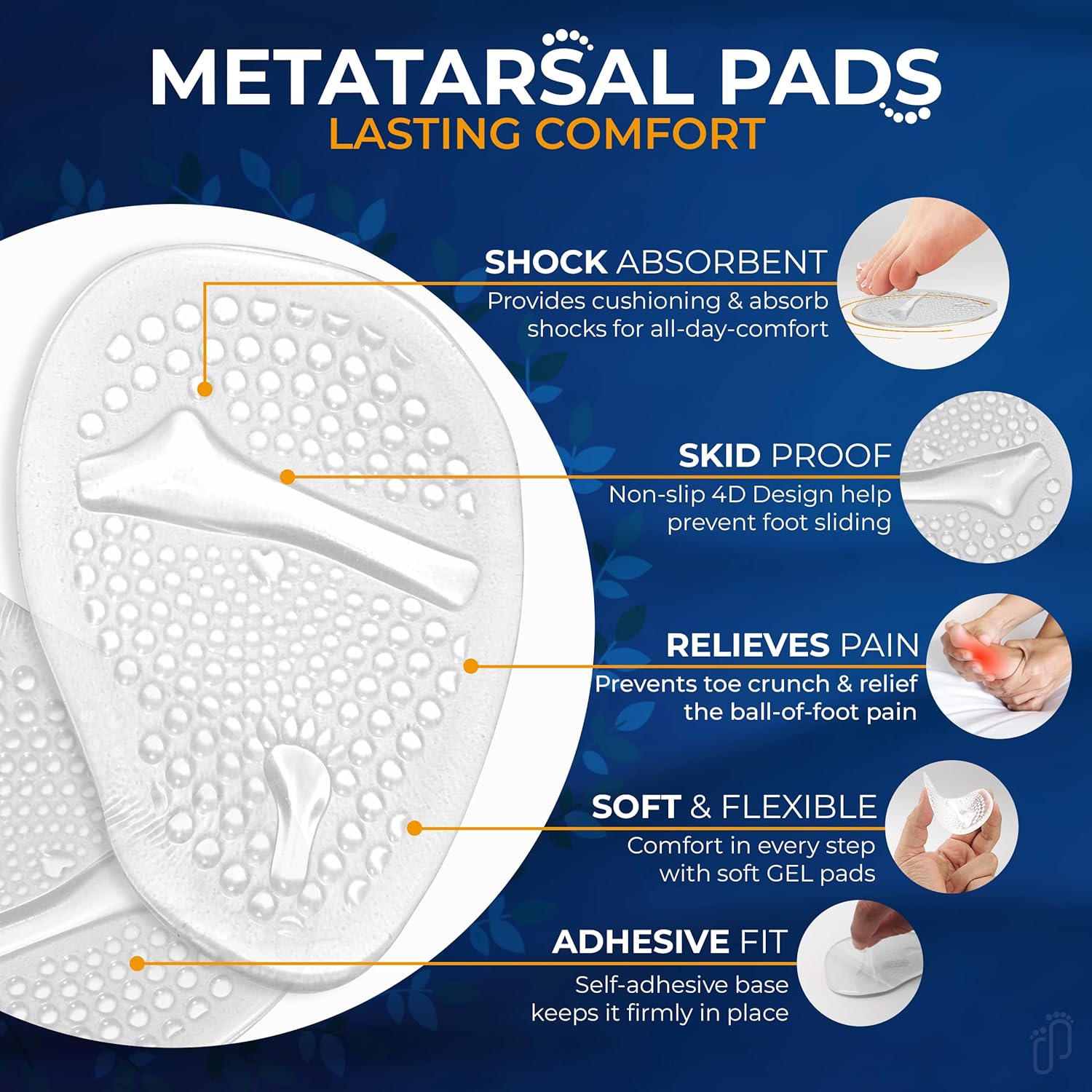 Prominent 4D design helps your ball of foot fit better with the pads for all day comfort & relief. Little ridge design & strong adhesive back prevent your foot from sliding forward or backward & give extra support.