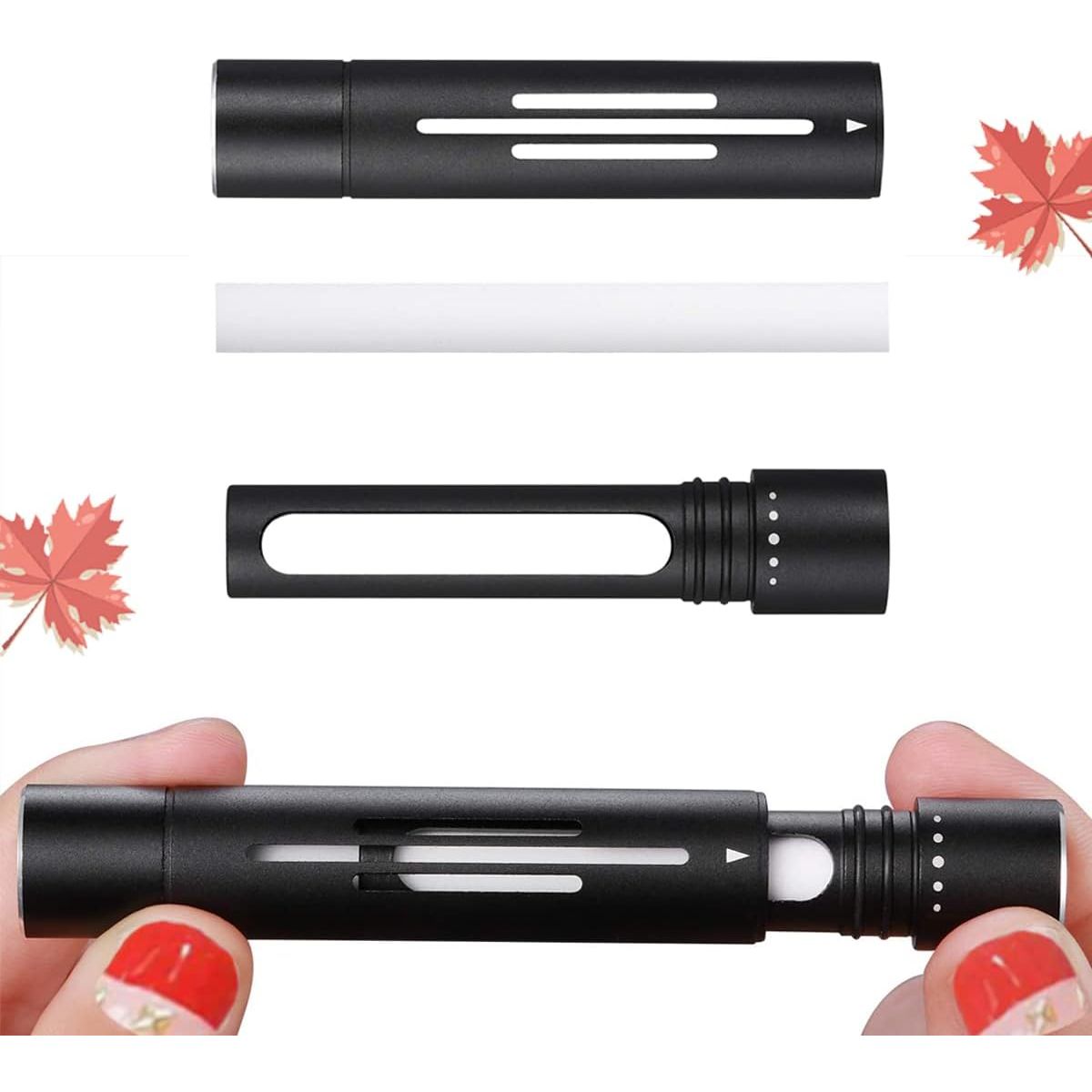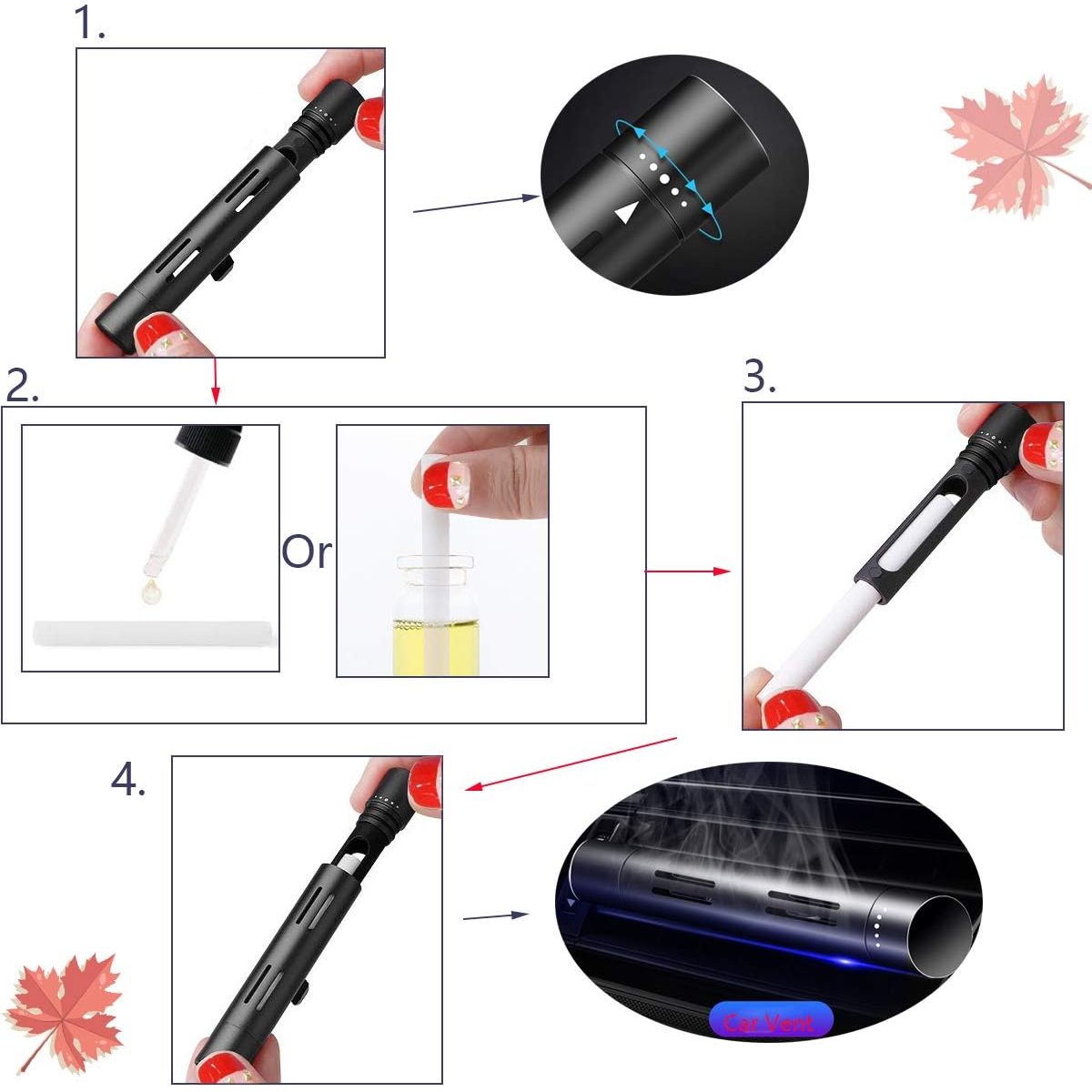 Product Specifications: Material: Aluminium Alloy Cylindrical Clip Size: 81mm*13mm (3.2 in* 0.51 in) Stick Size: 70mm* 7mm( 2.8 in*0.28 in) Each Clip Weight: 17g Total Weight:60g Package Included: 2 * Cylindrical car vent clip 12 * Refill sticks (UNSCENTED) 1 * Blue linen bag NO ESSENTIAL OIL INCLUDE. How to Use the Aroma Car Diffuser Vent Clip: 1. Twist off the lid marked with white dot clockwise and pull out the stick container. 2. Add essential oil to the refill stick and insert the stick to the container. 3. Insert the stick container back into the cylindrical case and press gently until it’s closed completely. Note: The refill sticks have NO SCENT , so you need to add essential oil or perfume on them yourself. How long will the aroma last depends on how many essential oil drops you put on the felt stick and what type of oils you use.
