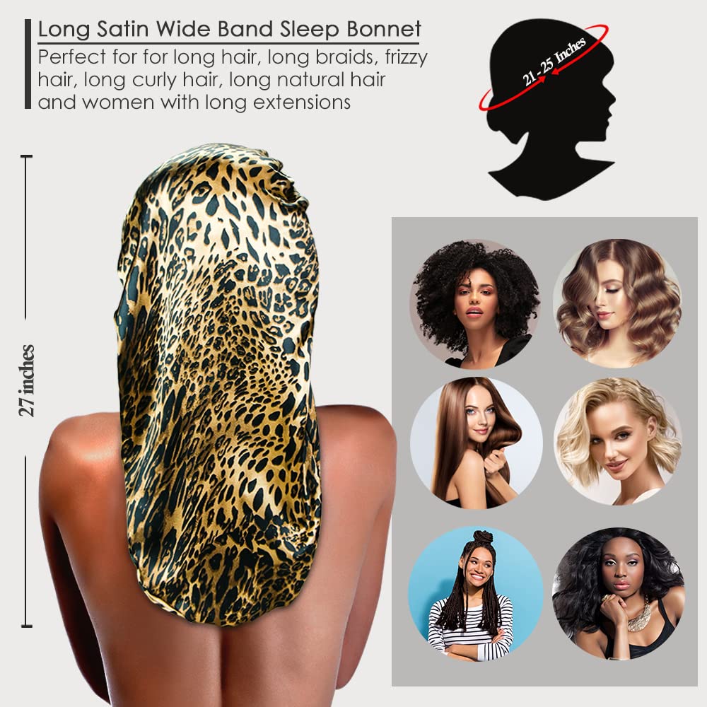 Parameter: Size: 27 x 10.2 inches Color:Black and Leopard Material: Satin Fabric Package Includes: 2 Pcs Features: 1. Wide soft band and 267 inches long length keeps your hair in place during sleeping all night, which won't tighten your head, suitable for holding natural hair, braids, wave, curly hair, long hair, up-do and more. 2. Two colors for you to choose which are depend on what you like. 3. Just slip it on and you do not have to tie it very tightly, it is so convenient for you everyday. Kind Tips: 1. Everyone has its own head size, it is only can be reference to our size. If your head are too small or big, it is not very suitable for you. 2. Please note that the products are compress packing, so there may be some wrinkles, just iron it after receiving. 3. Please keep your hair dry before you sleep with our bonnets.