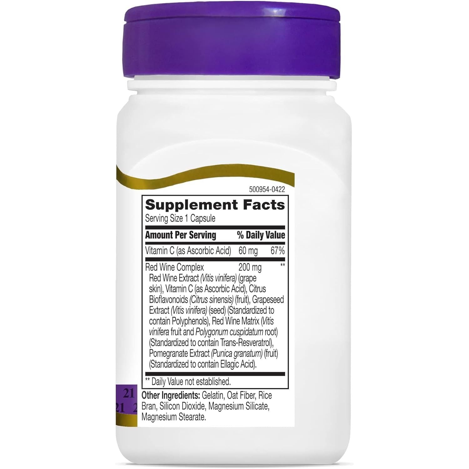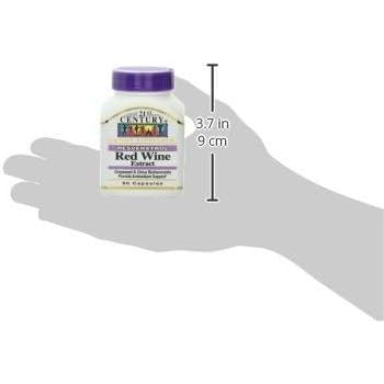 Product Description Important components such as resveratrol, polyphenols and ellagic acid help ensure you receive the natural benefits of grapes, while high-potency Vitamin C provides immune system support. These statements have not been evaluated by the . From the Manufacturer Resveratrol Red Wine Extract Important components such as resveratrol, polyphenols and ellagic acid help ensure you receive the natural benefits of grapes, while high-potency Vitamin C provides immune system support.* Ingredients Vitamin C, Red Wine Complex (Red Wine extract, Vitamin C, Citrus Bioflavonoids, Grapeseed extract, Red Wine matrix, Pomegranate extract) Other Ingredients Gelatin, Oat Fiber, Rice Bran, Silicon Dioxide, Magnesium Silicate, Magnesium Stearate Directions Take one (1) capsule one to two times daily, preferably with meals, or as directed by your healthcare provider. Safety Warnings Keep out of reach of children. Do not use if product appears to be tampered with or seal is broken. Store at room temperature. Antioxidants Free radicals are unstable compounds that can be caused by pollution, smoking, and even the sun. Antioxidants play a role in protecting the body from these destructive free radicals and help to maintain good health.* 21st Century has a variety of products to support your antioxidant needs.* About 21st Century The 21st Century Difference: Refreshingly Innovative, Realistically Priced, Reassuringly Reliable 21st Century has been providing quality vitamins and supplements to health minded consumers for over 20 years. We use only superior raw materials, cutting edge formulations and unique packaging: square vanilla-scented bottles, color-coordinated caps and easy-to-read labels. Our comprehensive product line offers the latest vitamin, mineral and specialty supplements, as well as standardized herbal extracts in vegetarian capsules, herbal slimming teas and natural deodorants. Our longevity and success bear testament to our continuous efforts in Research & Development. Our dedication to providing you with clinically developed and carefully blended formulations based on the latest scientific research, coupled with our commitment to state-of-the-art manufacturing and quality control enables us to provide innovative and affordable solutions for all your family’s health and wellness needs. We take great pride in providing you with a high quality product at a great price. The 21st Century Guarantee 21st Century products are unconditionally guaranteed for purity, freshness and label potency. To safeguard your health and well-being, all 21st Century nutritional products are manufactured using ingredients which pass stringent quality assurance standards under rigorous laboratory protocols and current Good Manufacturing Practices (cGMP).