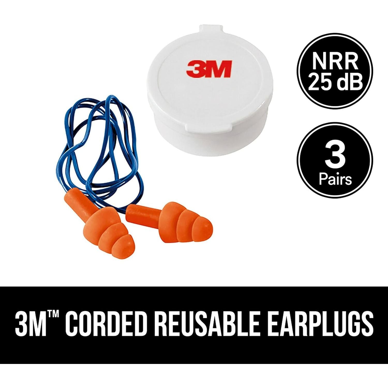 Product Description When you're on the job, it's important to keep distractions at a minimum. 3M Corded Reusable Earplugs helps by reducing your exposure to hazardous noises and providing a comfortable fit with your hard hat and other safety gear. The tri flange design helps you achieve a secure fit, and the soft, flexible feel is comfortable for extended wear. Whether you're landscaping your home or building one, reach for the quick and comfortable hearing protection of 3M Corded Reusable Earplugs. 3 pair pack + storage case. Noise Reduction Rating (NRR) 25dB. From the Manufacturer 3M TEKK Protection Corded Reusable Earplugs, used to help protect ears against noises at or exceeding 85 decibels, feature a triple-Corded Reusable Earplugs feature a Noise Reduction Rating (NRR) of 25 decibels and are comfortable to wear over an extended period of time and the attached cord reduces the chance of losing your earplugs between projects. Reusable, comfortable, lightweight and easy to use, 3M TEKK Protection Corded Reusable Earplugs are a great choice in hearing protection for both the pro and Dyer.