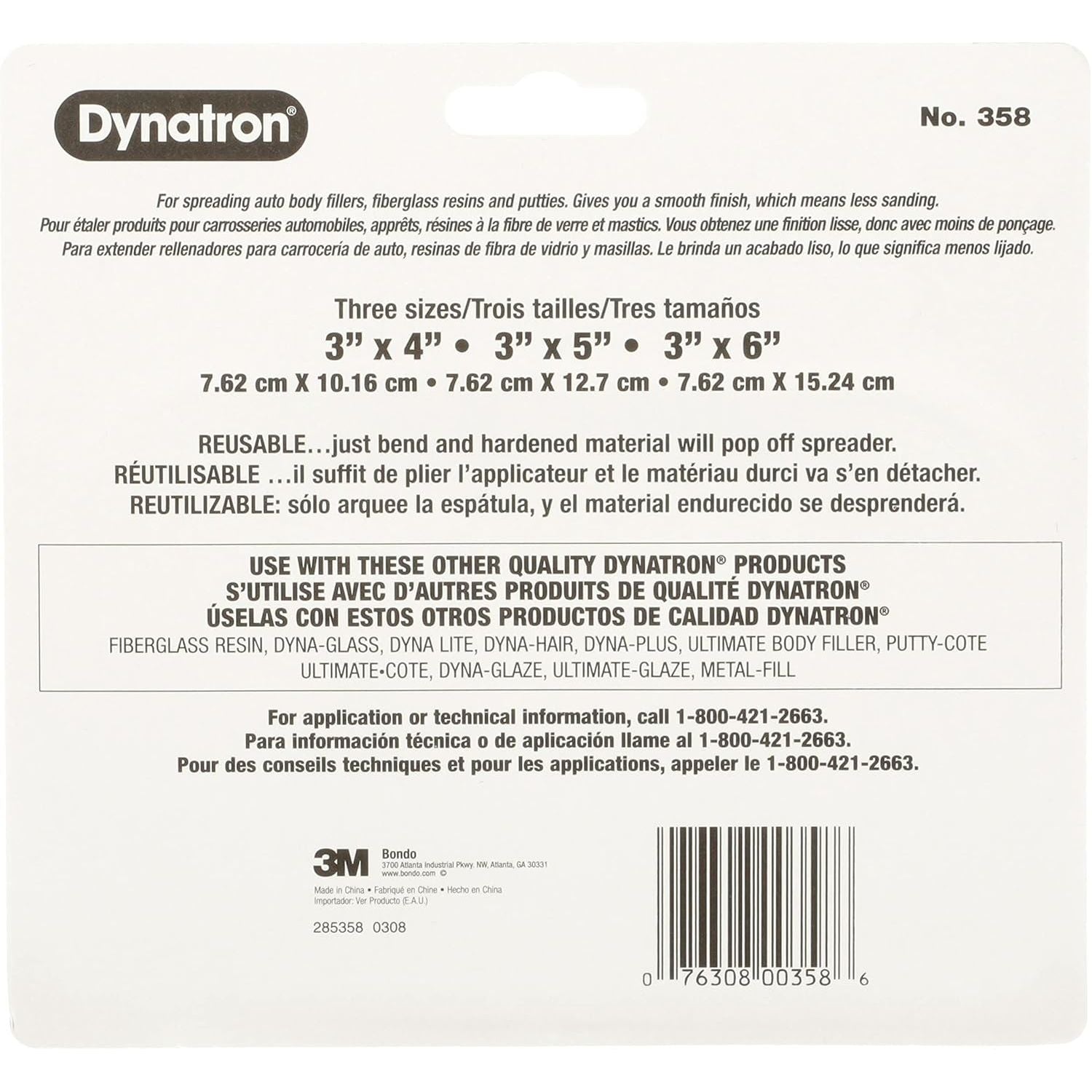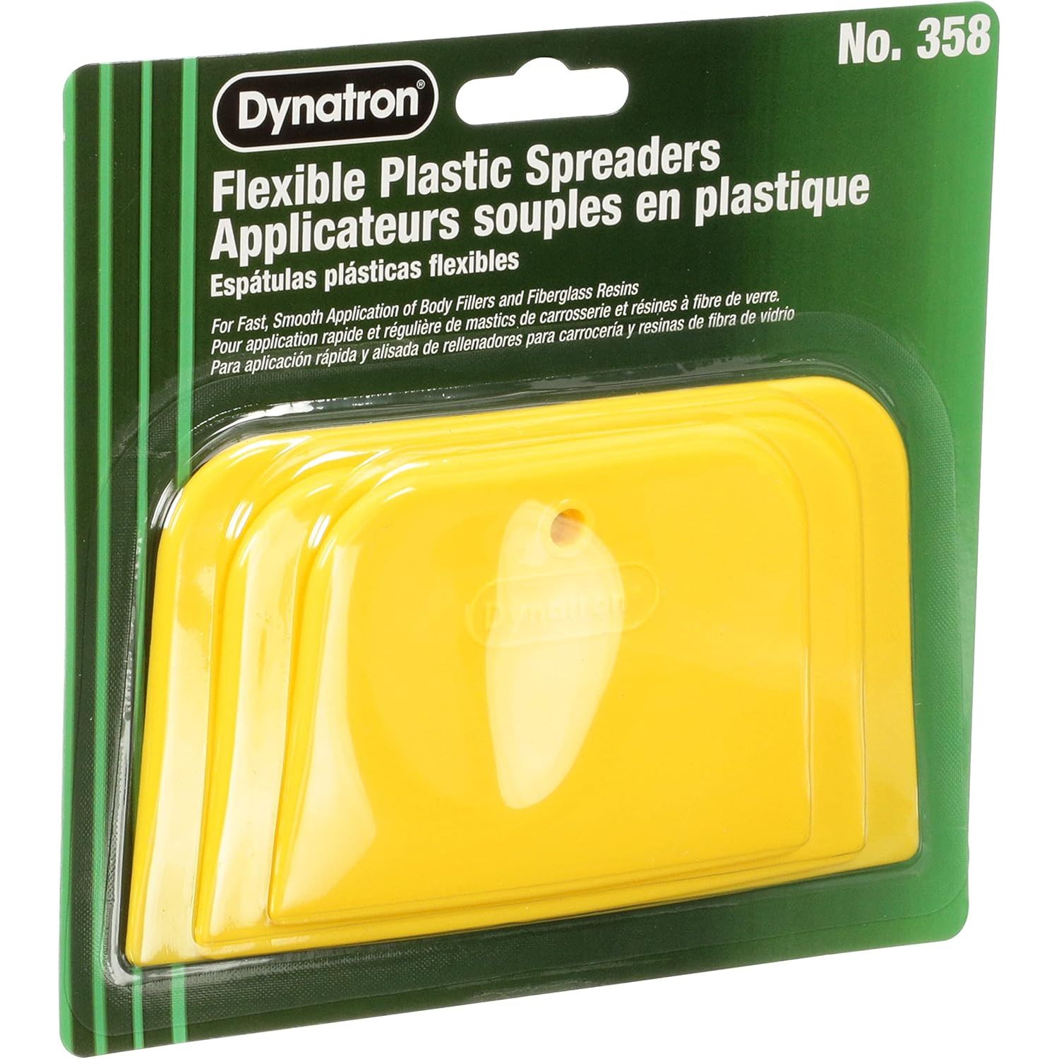 The Right Sizes for Just the Right Surfaces This 3-pack of 3" x 4", 3" x 5" and 3" x 6" Dynatron spreaders ensures that you’ll always have the right size filler spreader to create your best work in auto body repair. DynatronTM 3-Pack Spreaders gives you reliable tools for a large range of auto body filling projects using fillers, glazes, putties and caulks. Flexible edges make applying, spreading and shaping fast and easy. All spreaders are reusable, as cured filler material separates cleanly and completely from the spreader surface leaving it clean and ready for the next use. Dynatron and the Science of 3M DynatronTM 3-Pack Spreaders deliver much more than the right size spreader for the job. Each spreader is built for ease of use, fast cleaning and long product life - just what you need for an efficient and well-run collision repair business. A brand of 3M, Dynatron delivers science-driven benefits specifically for aftermarket auto body repair and maintenance. DynatronTM 3-Pack Spreaders deliver much more than the right size spreader for the job. Each spreader is built for ease of use, fast cleaning and long product life – just what you need for an efficient and well-run collision repair business. A brand of 3M, Dynatron delivers science-driven benefits specifically for aftermarket auto body repair and maintenance.