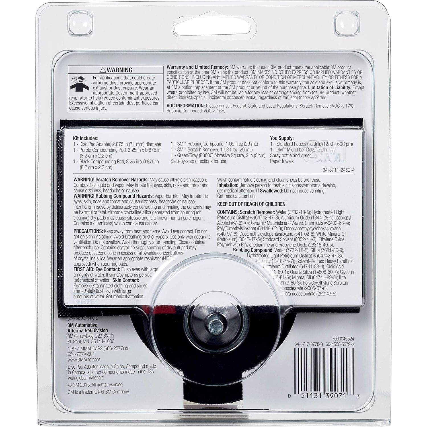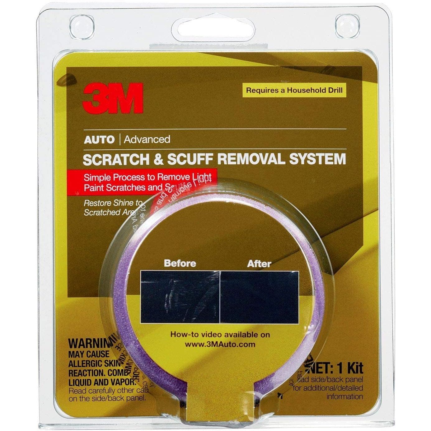 Product Description 3M Scratch Removal System eliminates minor scratches, scuffs and other small defects by sanding, compounding and polishing automotive clear coats. Our scratch remover for cars comes with all the specialty supplies to complete the job. You just need to supply a standard household drill and other basic household items. Amazon.com Simple 5-step process makes it easy to remove scratches. View Larger The 3M Scratch Removal System provides users with everything necessary, as well as the step-by-step guidance needed to repair small clear coat scratches on vehicles*. Consisting of a three stage system of sanding, compounding and polishing the clear coat of your car, it is designed to remove defects to this thin outer coat of your car's finish, like fine scratches to the door handle, door panels or the trunk. .caption { font-family: Verdana, Helvetica neue, Arial, serif; font-size: 10px; font-weight: bold; font-style: italic; } ul.indent { list-style: inside disc; text-indent: -15px; } table.callout { font-family: verdana; font-size: 11px; line-height: 1. 3em; } td.vgoverview { height: 125px; background: #9DC4D8 url(https://images-na.ssl-images-amazon.com/images/G/01/electronics/detail-page/callout-bg.png) repeat-x; border-left: 1px solid #999999; border-right: 1px solid #999999; padding-left: 20px; padding-right: 20px; padding-bottom: 10px; width: 250px; font-family: verdana; font-size: 12px; } Easy & inexpensive clear coat scratch repair. View larger . Everything you need right out of the box (drill not included). View larger . Save Money Repairing Vehicle Scratches Vehicle are manufactured with exterior finishes comprised of a variety of layers: primer, colored paint, and a final very thin top layer known as the clear coat. The 3M Scratch Removal System is designed to remove defects to the clear coat with the added aid of a user supplied household drill. Examples of repairable defects that the 3M Scratch Removal System is able to easily repair include fine scratches from automatic car wash brushes, vegetation scrapes, etc. Common areas in need of this sort of repair are the area around the door handle or the trunk just to name a few. How Does it Work The 3M Scratch Removal System is based in a simple 3-tiered approach to scratch removal: sanding using the included 3000 grit sandpaper to reduce the scratch, application of 3M rubbing compound and refining of the scratch area, and finally polishing and restoring the scratch area using a 3M polishing pad, scratch remover compound and a common household drill. An additional recommended step is to apply automotive wax in the repaired area to protect the car's finish, since you have removed an area of its clear coat. When removing a defect in the paint surface, you are actually removing a very thin layer of the clear coat paint. This procedure is commonly performed by professional technicians in automotive collision shops, car dealerships, detail shops, and assembly plants for high dollar amounts. Now, you can do it yourself for a fraction of the cost. Key Features Guaranteed to remove light paint scratches and scuffs from your vehicle's outer clear coat finish Three tiered repair system that is easy to use Minimal additional items required along with kit, including: household drill, microfiber cloth, water and a spray bottle Saves users money by performing scratch repair themselves, while improving the paint appearance What's in the Box The 3M Scratch Removal System contains one disc pad holder, one 3000-grit abrasive square, one purple compounding pad, one black polishing pad, one 3M rubbing compound (1 oz), one 3M scratch remover (1 oz), and step-by-step directions for use.** Limitation of Liability Except where prohibited by law, 3M will not be liable for any loss or damage arising from the 3M product, whether direct, indirect, special, incidental or consequential, regardless of the legal theory asserted, including warranty, contract, negligence or strict liability. About 3M 3M is fundamentally a science-based company. They produce thousands of imaginative products, and they are a leader in scores of markets - from health care and highway safety to office products and abrasives and adhesives. * Scratches that cannot be completely removed go deeper than the surface of the clear coat. ** User supplies: standard household drill (1200-1600 rpm), 3M microfiber detail cloth, spray bottle, water, paper towels.