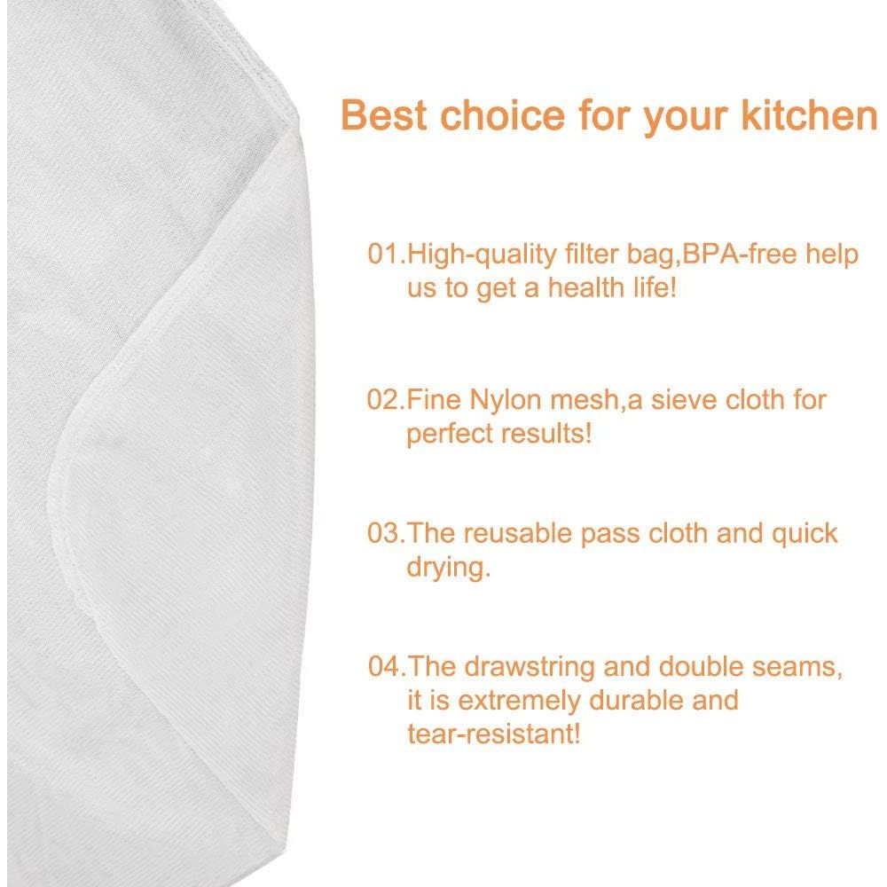 - 4. MULTIPLE USES: High quality nylon food strainer bags withstand hundreds of uses. Much finer mesh filters out much more pulp and it doesn't stretch out in the same way that organic materials do,offer us a safe and healthy choice.