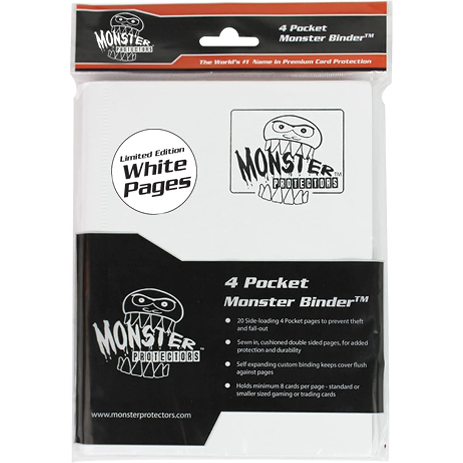 Monster Binder - 4 Pocket Matte White Album with WHITE PAGES- Compatible with Yugioh, Magic, and Pokemon Cards: 160 card carrying capacity side loading pockets with built in AntiTheft system. Cushioned pages for added protection. Pages are actually sewn in for added durability. Custom binding expands as you put more cards into it. Monster Protectors binders, albums, and portfolios are the most in-demand binders on the TCG market. There is no other product that matches the level of storage space and durability. These binders feature a 160 card carrying capacity, with side loading pockets that are both antitheft and prevent your cards from slipping out of place. Each of the pages is cushioned to give your cards an extra level of protection. Monster Protectors binders also feature a custom binding that expands as you put more cards into it, so the cover always stays flush against the pages, never exposing your cards to harm. All of the pages are also stitched in rather than being glued in so the binders are incredibly durable and last for years.