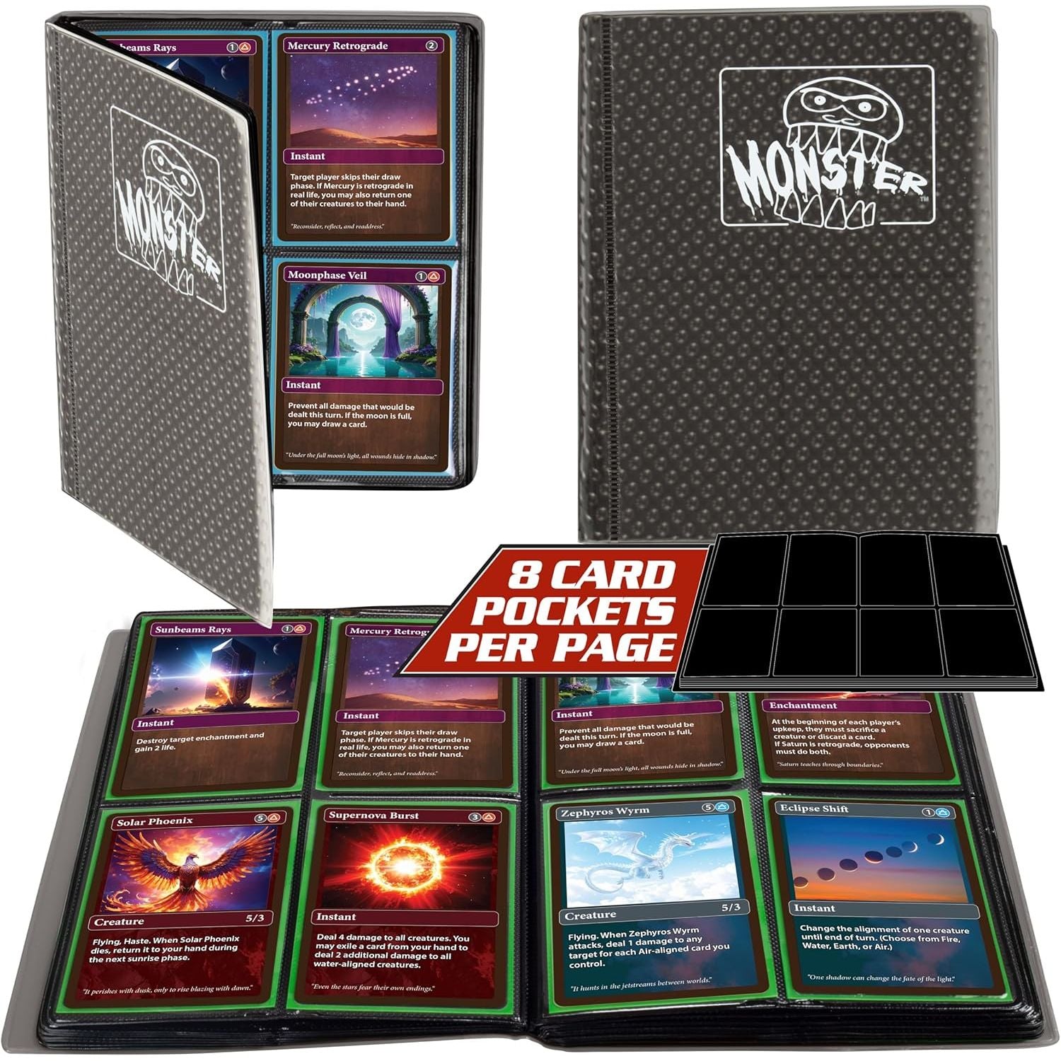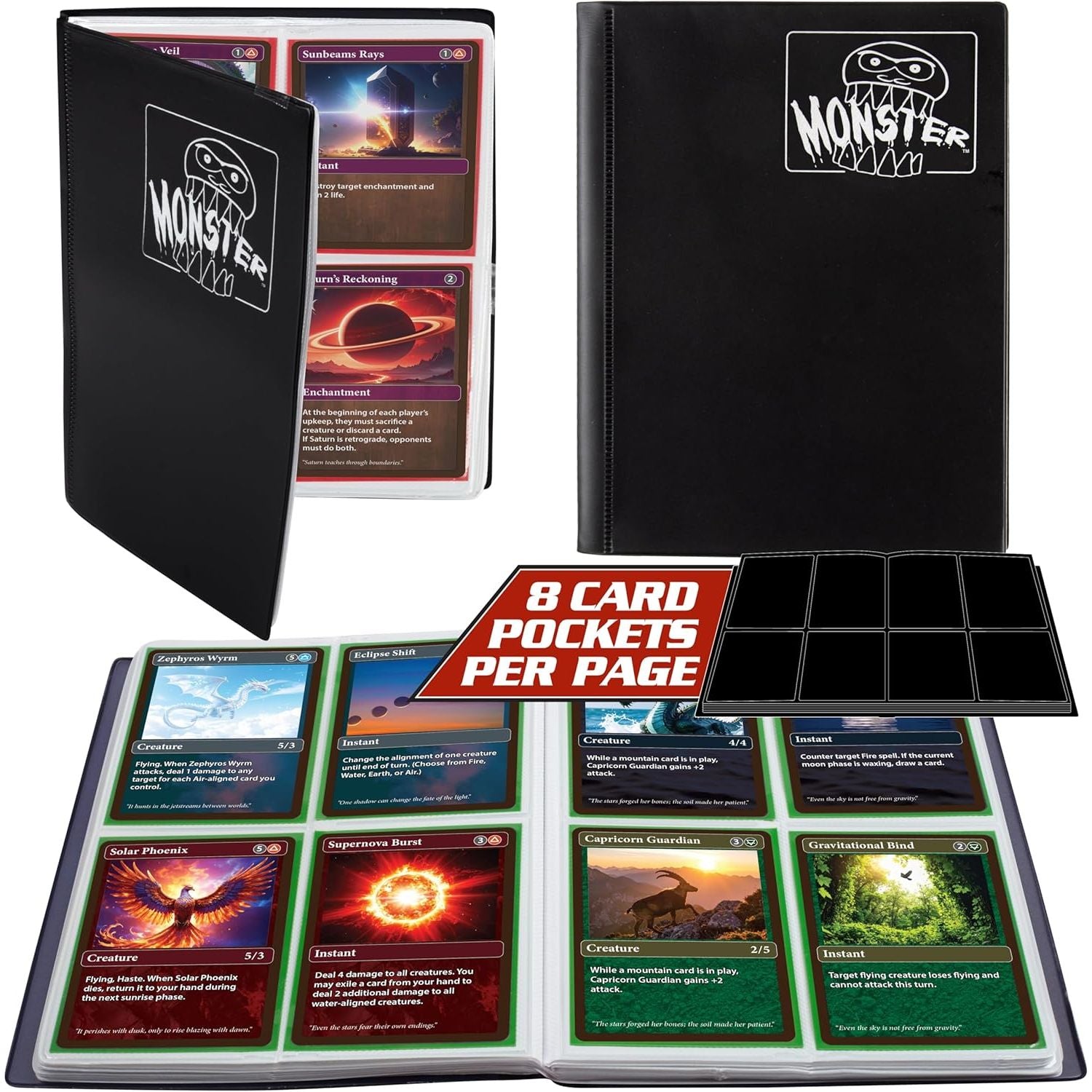 • Reinforced, Tear-Resistant Pages Holds 160 Standard-Size Cards: Designed with 4 pocket pages that lay flat to display 8 cards per spread, this binder securely holds up to 160 trading cards. Reinforced, non-rip pages keep your collection safe and intact. Compatible with standard-size cards from Pokémon, Yu-Gi-Oh!, Magic: The Gathering (MTG), sports cards, and more.