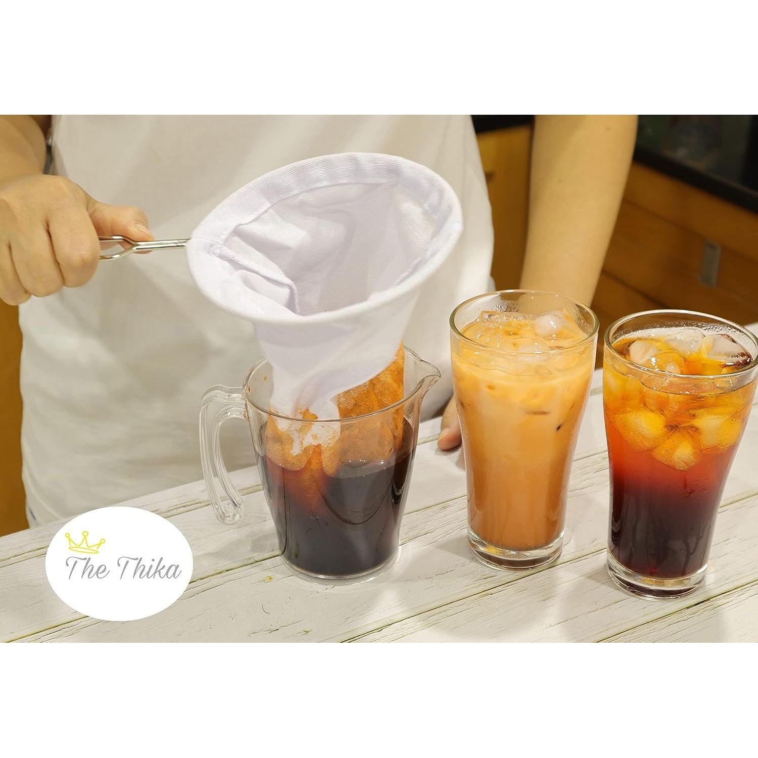 The generous 5.3-inch opening is perfect for preparing large quantities of Thai iced tea, coffee, or other beverages at once. Traditional Thai Style, Experience authentic, traditional brewing methods with this classic cloth tea sock and metal handle. Not just for Thai tea, Use it as a pour-over coffee filter, a fine-mesh strainer for coconut or almond milk, or a juicer for all kinds of homemade juices. Muslin cloth effectively strains grounds and sediments, resulting in a perfectly smooth, rich, and flavorful drink every time. The filter is washable and reusable, offering a sustainable alternative to disposable filters.