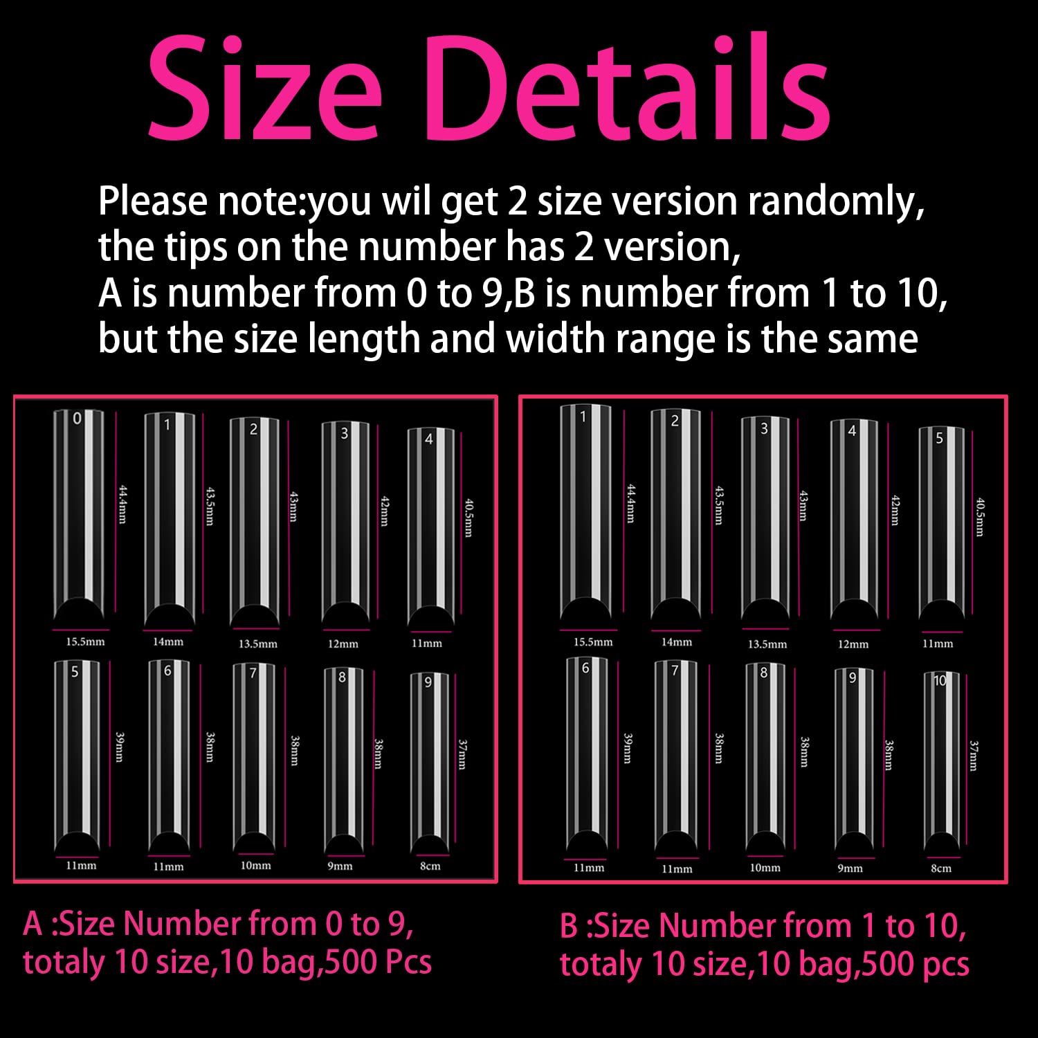 - 500 Pcs Clear Extra Long C Curve False Nail Tips,XXL C Curve Acrylic Fake Nail Tips with Bag for Nail Salon and DIY, Extra Long French Tips Half Cover Straight Square Nail Tips 10 Sizes
