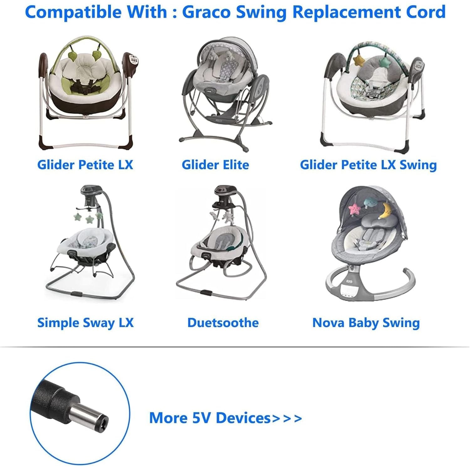 - 5V for Graco Baby Swing Power Cord, Compatible with Graco Simple Sway Swing, DuetSoothe, Glider LX/Elite/Premier/Petite LX, DuoGlider, Sweetpeace, Duetconnect LX, Baby Swing Charger - 3.3ft
