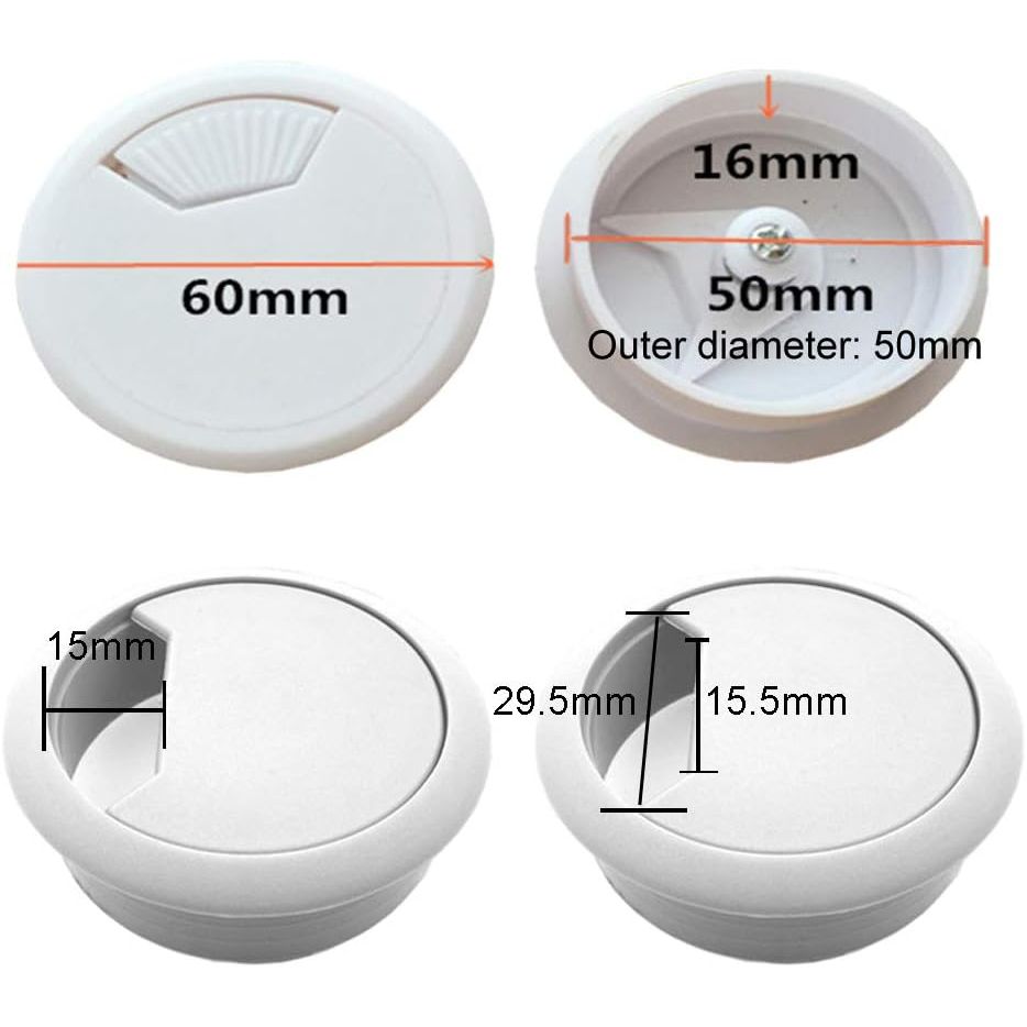 Package included: 6 Pcs 2 Inch plastic desk cord cable hole cover grommet Made of ABS material, wear-resistant, corrosion-resistant, durable to use Color: White Fit for 2 inch (50mm) hole Deep: 16mm