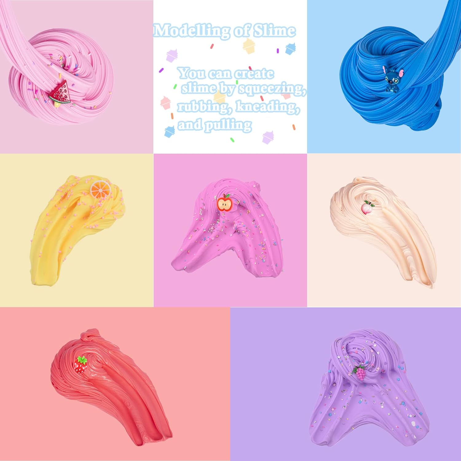 - ✦Slime Kits-7 different colored butter slime set(7*45ml), Upgraded version of the gift box packaging, Each color of butter slime comes with a fun accessory, and fruit slices and candy crumbles