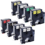 - Package includes: 7 Colors in one set: Black on Clear (Equivalent to DYMO 45010), Black on white (Equivalent to DYMO 45013), Black on Blue (Equivalent to DYMO 45016), Black on Red (Equivalent to DYMO 45017), Black on Yellow (Equivalent to DYMO 45018), Black on Green (Equivalent to DYMO 45019), White on black (Equivalent to DYMO 45021).