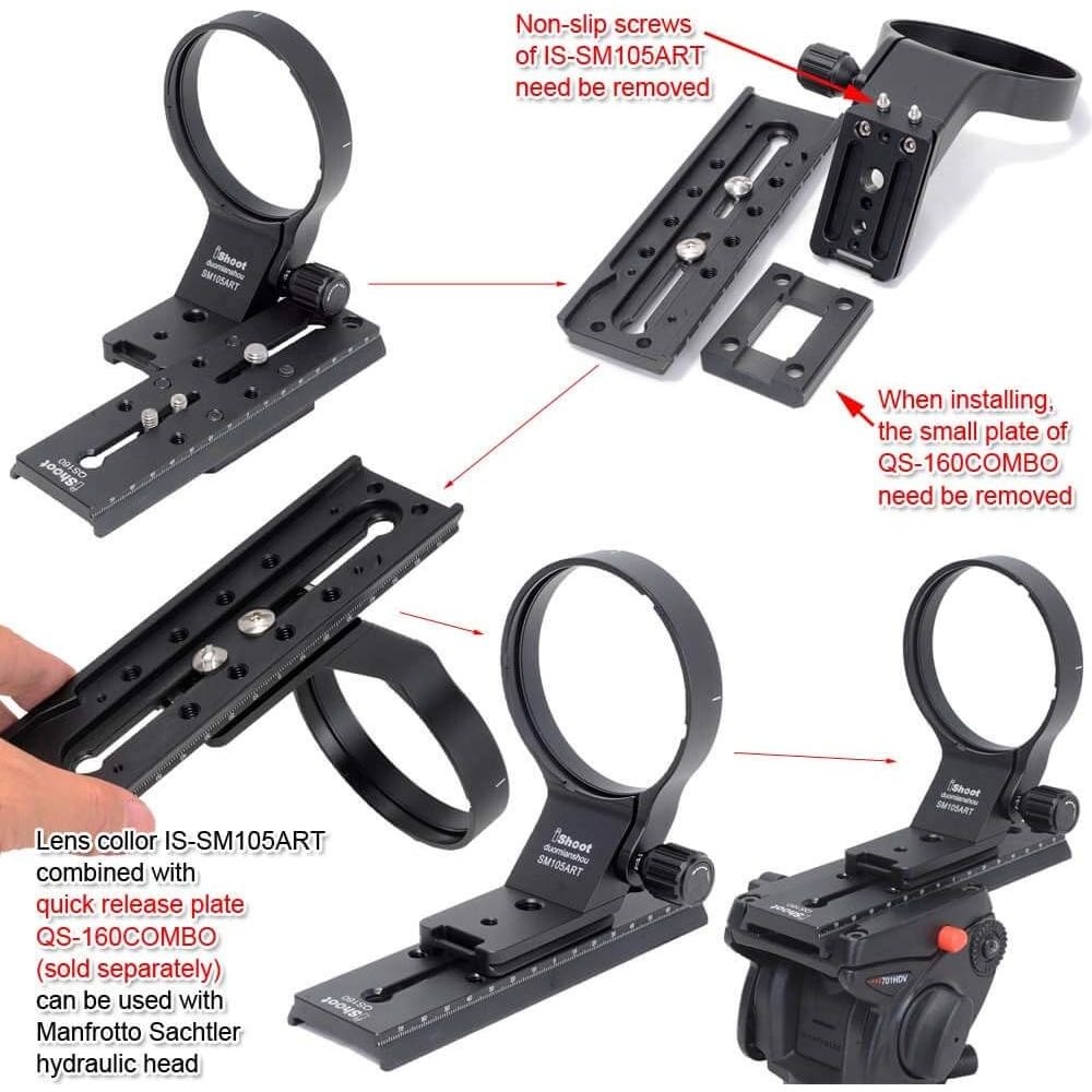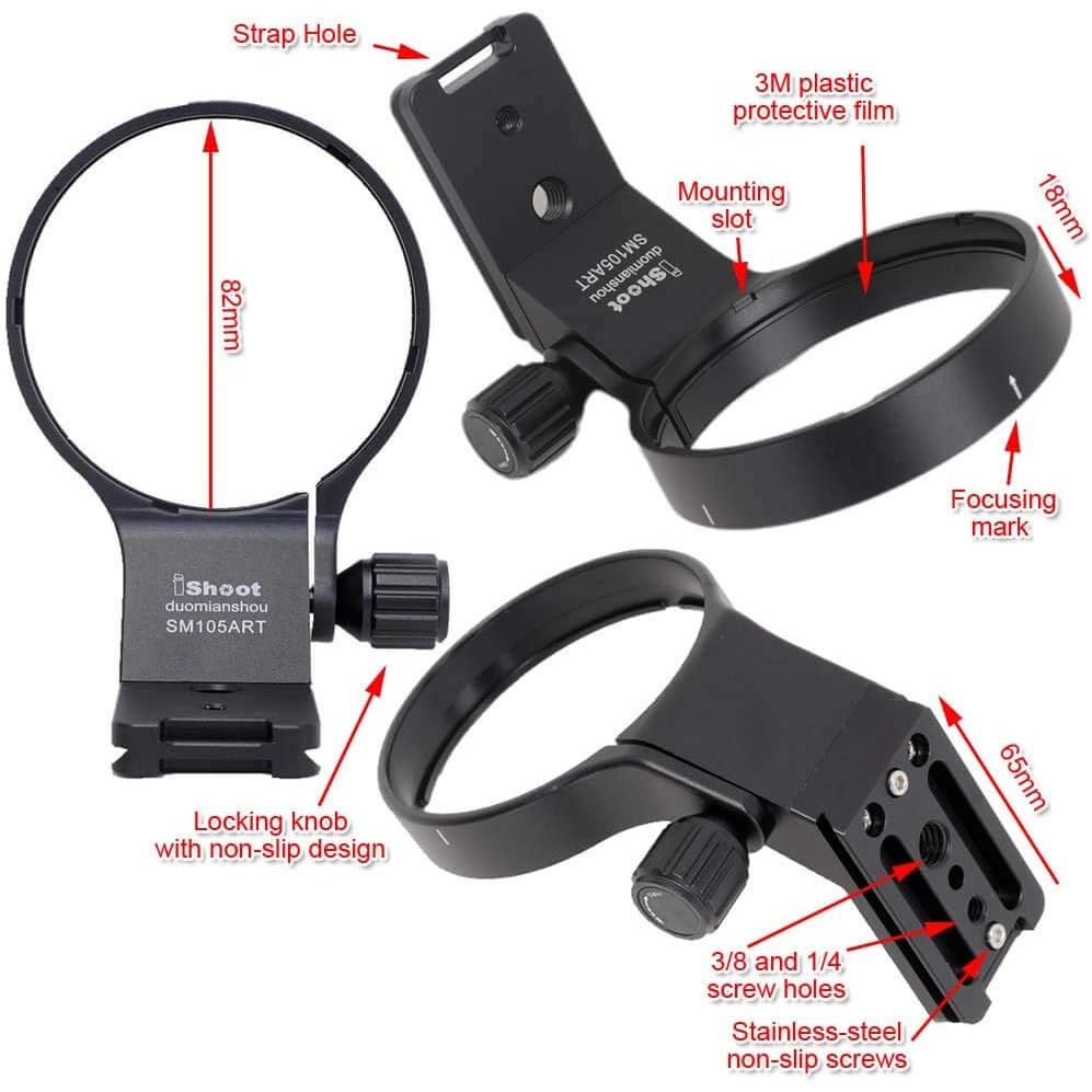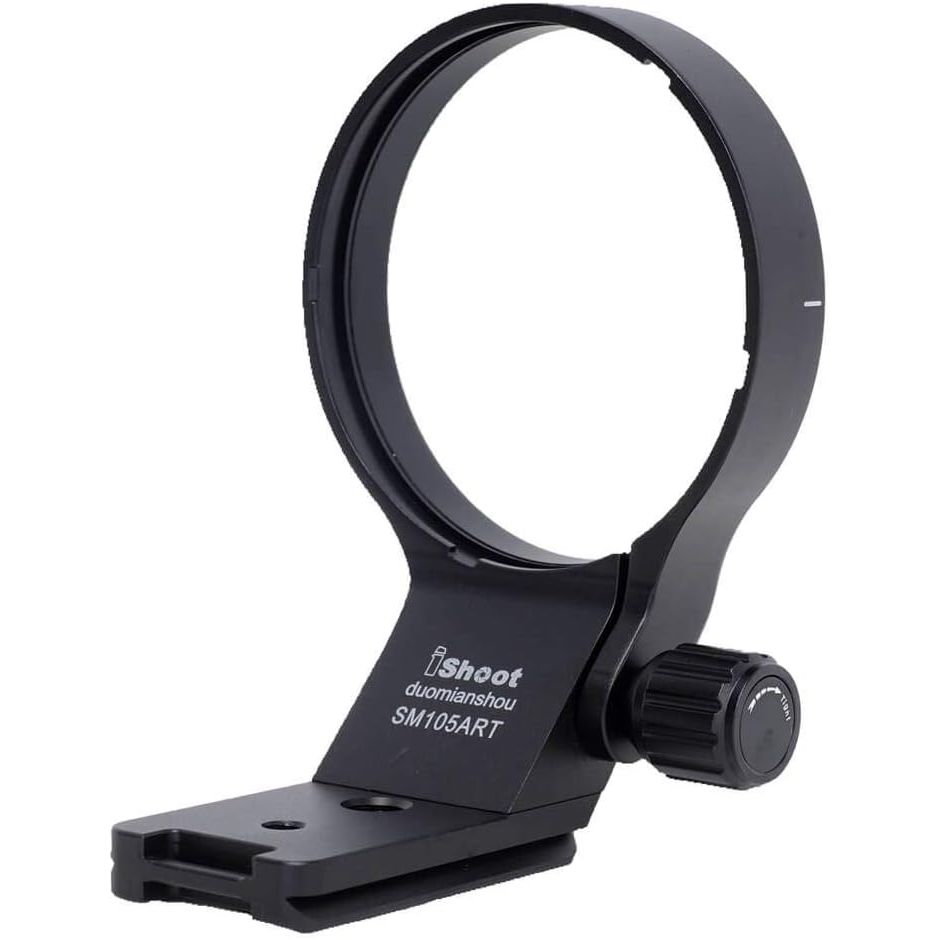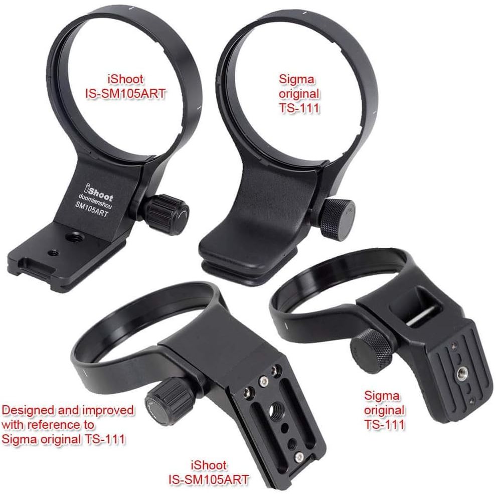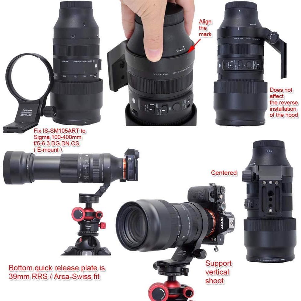 iShoot Lens Collar Tripod Mount Ring IS-SM105ART Compatible with Sigma 105mm F1.4 DG HSM Art (EF/FX/FE/L Mount) & Sigma 100-400mm f/5-6.3 DG DN OS (E / L Mount) Not Compatible with Sigma 100-400mm f/5-6.3 DG OS HSM Contemporary (EF / F Mount) lens and other lenses Bottom is Arca Fit Quick Release Plate Feature for RRS / Arca-Swiss Fit Ballhead Clamp Features: 1. The tripod ring is made of Aviation Aluminum, CNC precisely machined, hollow-out weight reduction design, polished and surface anodized finish. The appearance and exquisite workmanship are much better than similar products made by mold; 2. The lens support collar is designed and improved with reference to Sigma original TS-111; inner diameter is about 82mm, width is about 18mm, the inner wall has grooves and notches, and 3M plastic protective film is attached; locking knob with non-slip design; 3. The bottom quick release plate of the Lens support is about 65mm in length, adopts ARCA-SWISS / RRS 39mm standard fit, and reserved 1/4 and 3/8 screw holes, equipped with stainless steel non-slip screws, net weight about 170g; 4. Bottom quick release plate is AS standard, compatible with RRS / ARCA-SWISS / PMG / WIMBERLEY / MARKINS / PHOTOCLAM / SUNWAYFOTO / BENRO / SIRUI / MARSACE / ISHOOT ball head of Arca 39mm fit, suitable for iShoot IS-JZ30 / IS-JZ50 / IS-JZ64 / IS-QJ58 / IS-QJ64-FD / IS-JZ60BK / IS-JZ70MFT / IS-JZ80BK. Compatible with: Sigma 105mm f/1.4 DG HSM Art (EF/FX/FE/L-mount) Sigma 100-400mm f/5-6.3 DG DN OS (E / L Mount) Not Compatible with Sigma 100-400mm f/5-6.3 DG OS HSM Contemporary (EF / F Mount) lens and other lenses Package Includes: 1 x iShoot Lens Collar IS-SM105ART (Note: The other items in the photos not listed here are for illustrating only, not included)