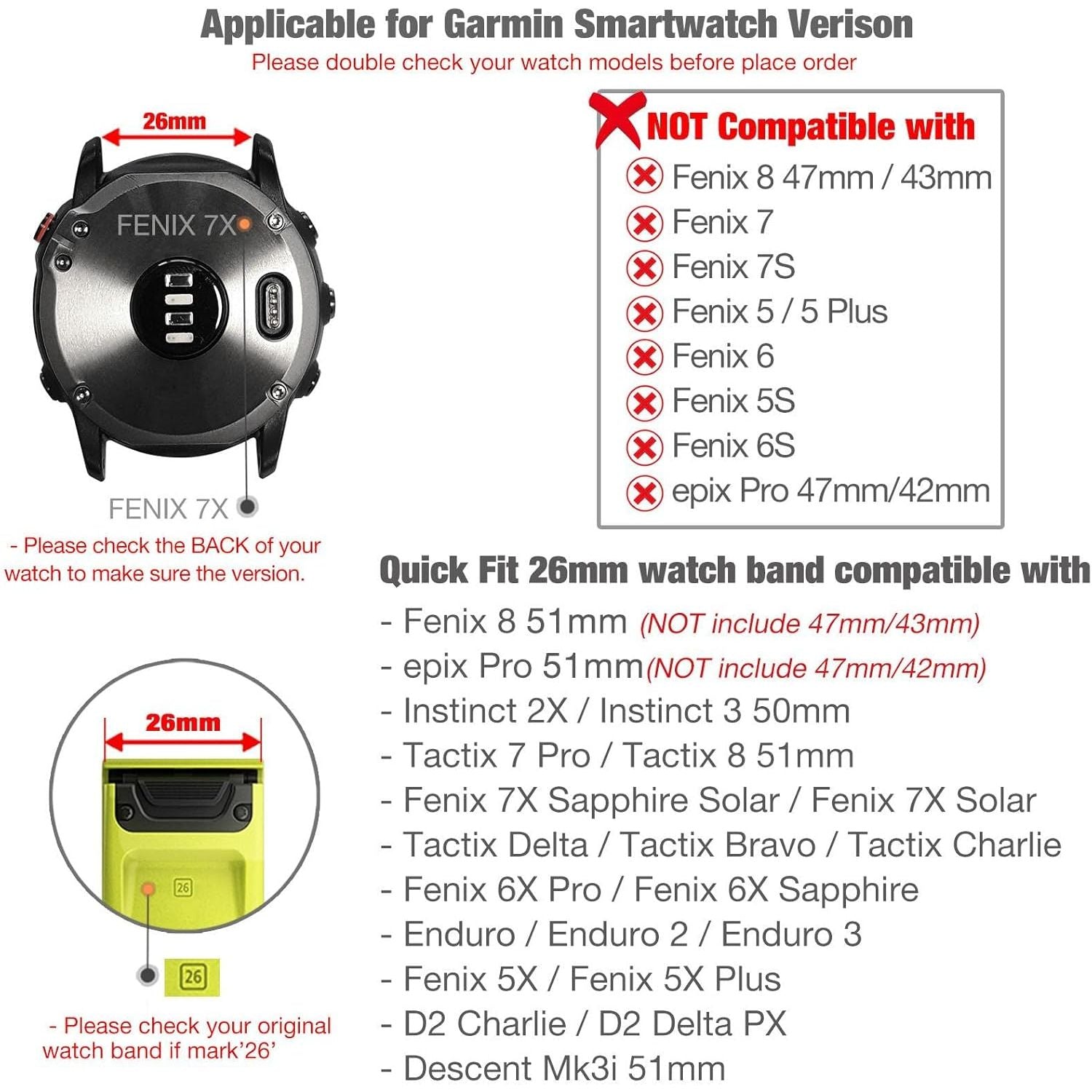 - ▶ Compatible Models, 26mm watch band Compatible with Garmin Fenix 8 51mm, Tactix 8 51mm, Enduro 1/2/3, Instinct 2X, Instinct 3 50mm, epix Pro 51mm, Fenix 7X Sapphire Solar / Fenix 7X Solar, Tactix 7 Pro, Fenix 5X/Fenix 5X Plus,Fenix 6X Pro/Fenix 6X Sapphire,D2 Charlie/D2 Delta PX,Quatix 3,Tactix Bravo/Tactix Charlie/Tactix Delta, ONLY Watch Band, NOT inclued smart watch.