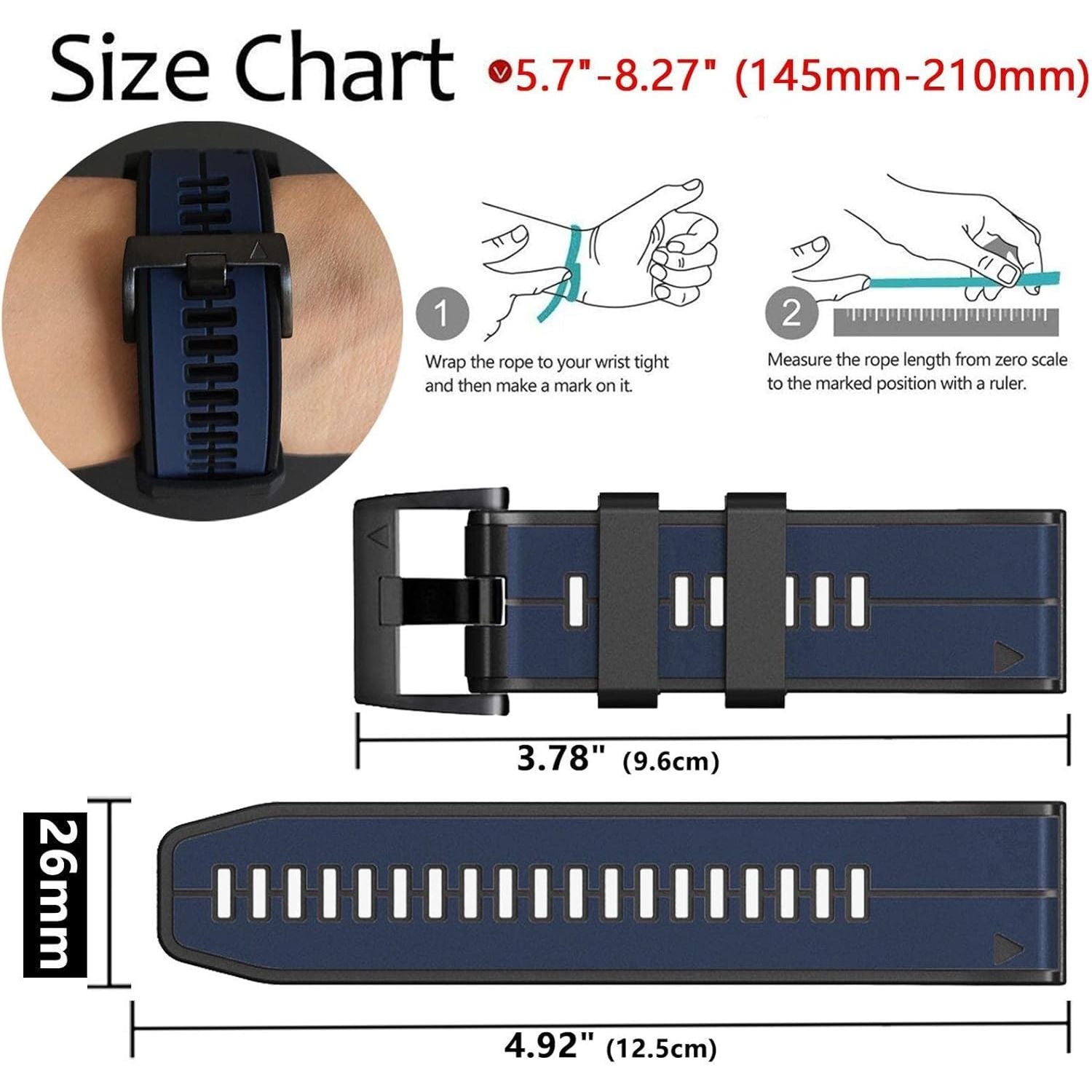 Notice: -- Watch Band only, Smart Watch not included. -- NOT for Fenix 5S/Fenix 6S -- NOT for Fenix 7S / Fenix 7 -- NOT for Fenix 5/Fenix 5 Plus/Fenix 6, -- Please check the BACK for your watch,it clear show the final model if you don't know your model. or check your original watch band if mark 'QuickFit 26' From Abanen, Smart Watch Accessories Brand -- Made of soft and non-allergenic silicone,comfortable touch feeling on your wrist,especially for sports,hiking,running or other outdoor activities. -- 26mm Quick Release Fit adapter,easy and direct to install / removal -- Double bicolor design,give your smartwatch a whole new and unique look. -- Fit wrist size 5.71"-8.27" inch(145mm-210mm) Compatible with Garmin Smart watch: - Tactix 8 51mm - Fenix 8 51mm 7 (NOT included epix Pro 43mm/47mm) - epix Pro 51mm (NOT included epix Pro 42mm/47mm) - Instinct 2X / Instinct 3 50mm - Fenix 7X Sapphire Solar / Fenix 7X Solar (Not include Fenix 7S / Fenix 7) - Tactix 7 Pro - Enduro / Enduro 2 / Enduro 3 -- Fenix 6X Pro / Fenix 6X Sapphire (Not include Fenix 6S / Fenix 6) -- Fenix 5X / Fenix 5X Plus (Not include Fenix 5S / Fenix 5) -- Fenix 3 / Fenix 3 HR -- Tactix Bravo / Tactix Charlie / Tactix Delta -- Descent Mk1 / Descent Mk2i/Descent Mk2 / Descent Mk3i 51mm -- Quatix 3