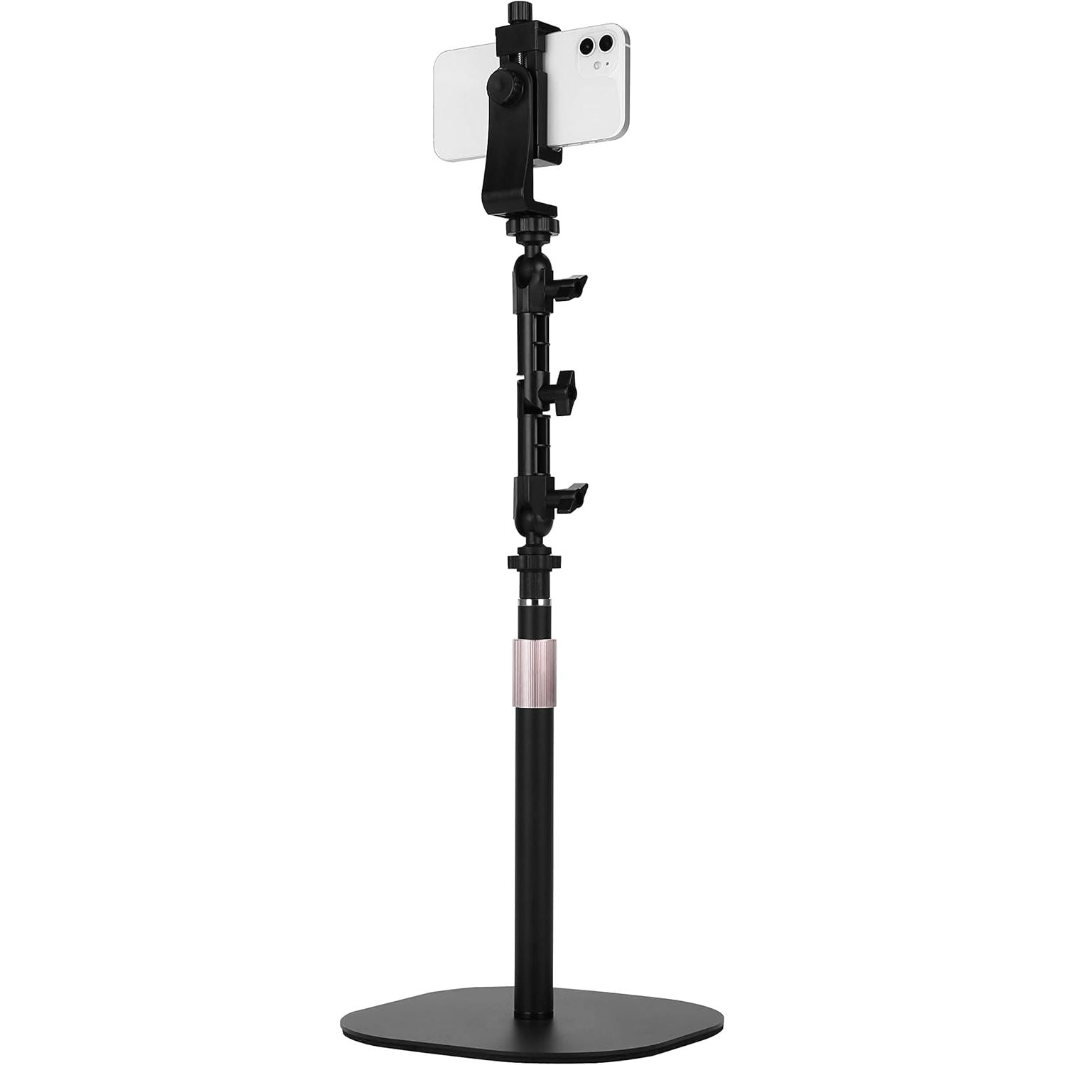 - What you get: 1 x Adjustable Pole Rod ;1 x Metal base; 1 x Folding Joint Arm;1 x Universal Phone Clip;