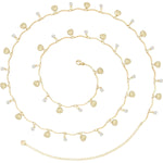 - The body chain features a strand of 18k gold plated satellite beaded curb ball chain, a lobster clasp and a extender. The width of the chain on the minimalist beach chain measures around 2 mm. The durable satellite chain is the leading role of this beautiful sexy bikini chain. The length of the 18k gold plated chain is about 29.5” with a 6” extender. And the lobster clasp of the adjustable chain helps the necklace be worn easily.