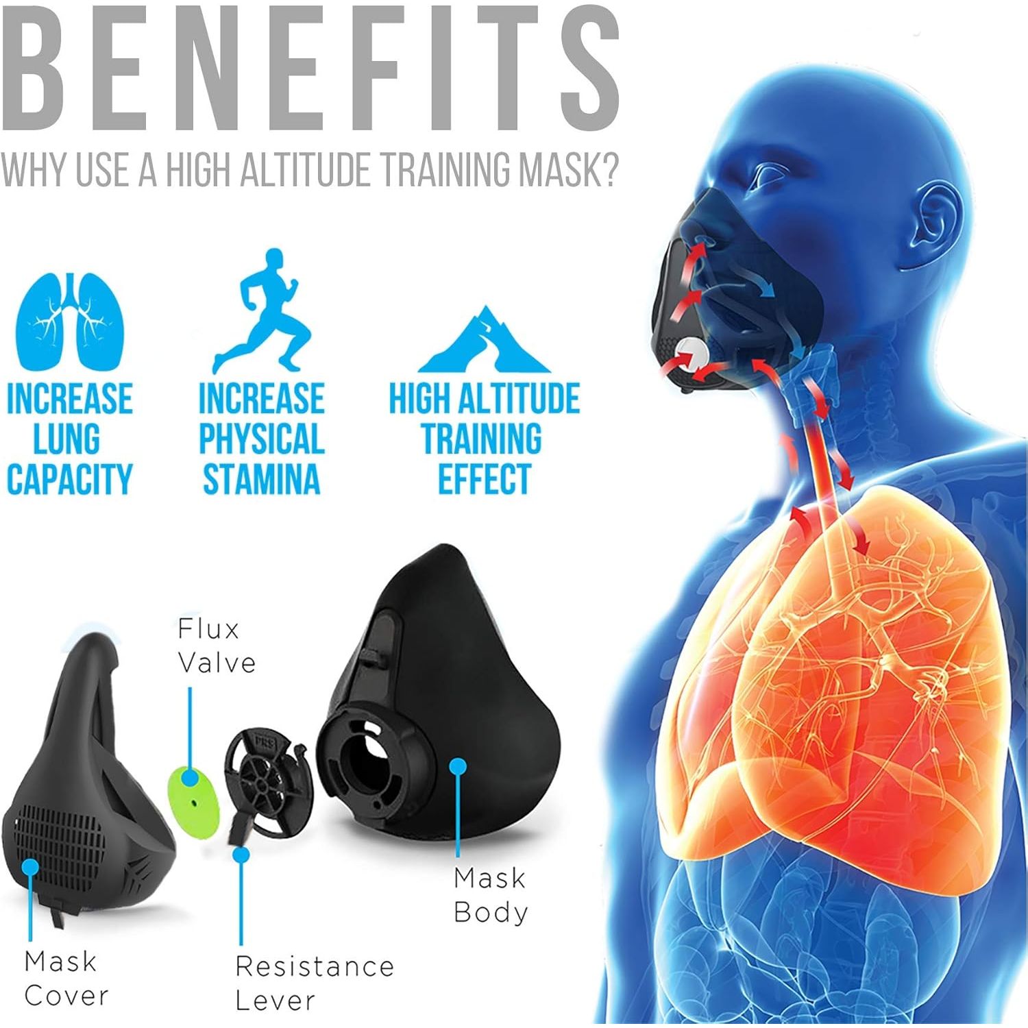 Aduro Sport High Altitude Training Workout Mask will increase your inhalation load while training is like lifting weights for your breathing muscles. More respiratory power and stronger breathing muscles will supercharge your stamina and endurance.