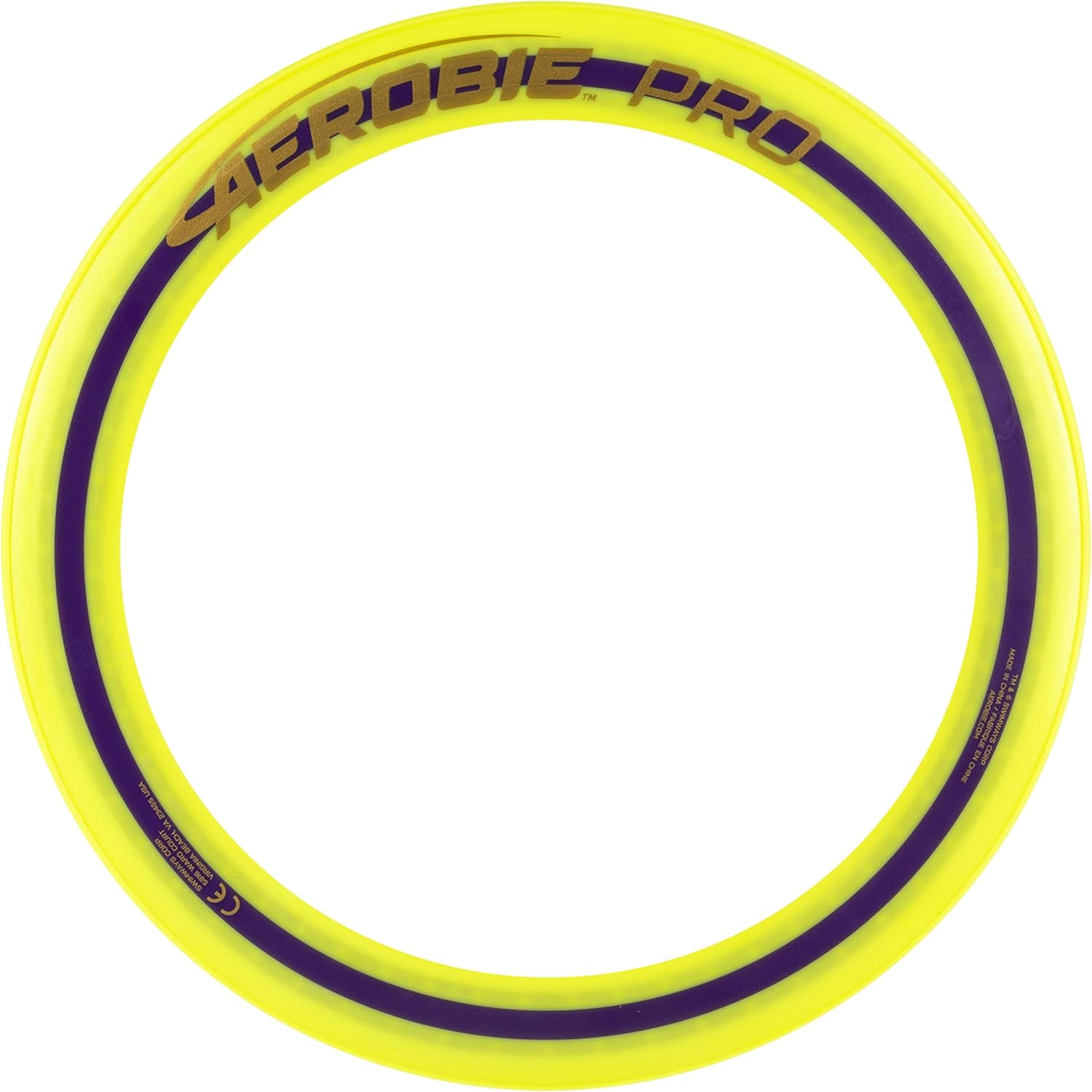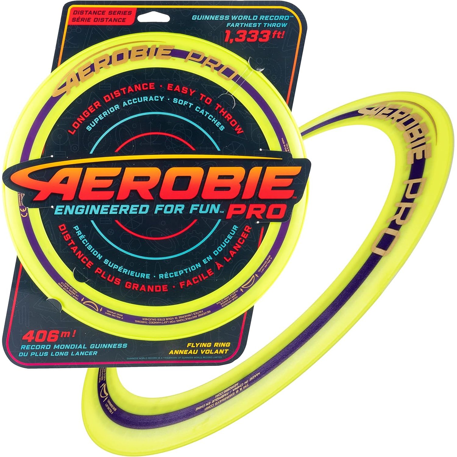 Product Description For exhilarating flying disc games, nothing compares with the high performance of the Aerobie Pro Ring. This flying disc was used to set a world record for the farthest throw, an amazing 1,333 feet (406 meters)! The thin design of this 13-inch flying ring allows the disc to travel longer distances and features soft edges for comfortable catches. The open center allows each player to personalize their throwing and catching style – catch the edge with your hand or use the center to catch it with your arm or foot. Create your signature moves with Aerobie flying discs! The Aerobie Pro Ring measures 13 inches in diameter. Available in assorted colors. Sold individually. Note: This disc does not float in water. Ages 12+ From the Manufacturer Our Pro Ring set the Guinness World Record for the farthest throw. This ring features soft rubber edges for comfortable catches and awesome throws. Fun for the entire family!