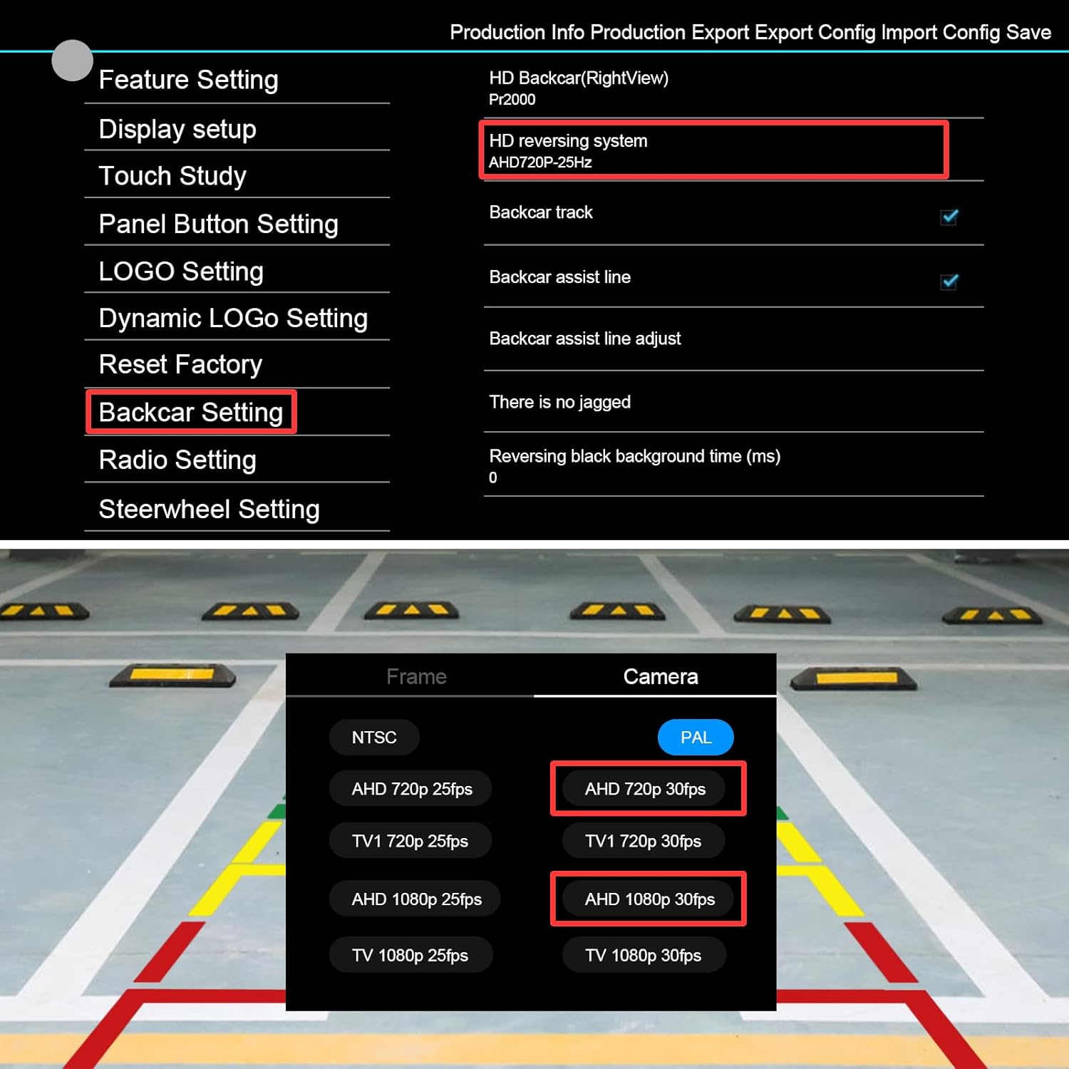 Car settings>>Factory settings>>Reverse(Picture)settings>>select AHD 1080p 25fps/AHD 720p 25fps.