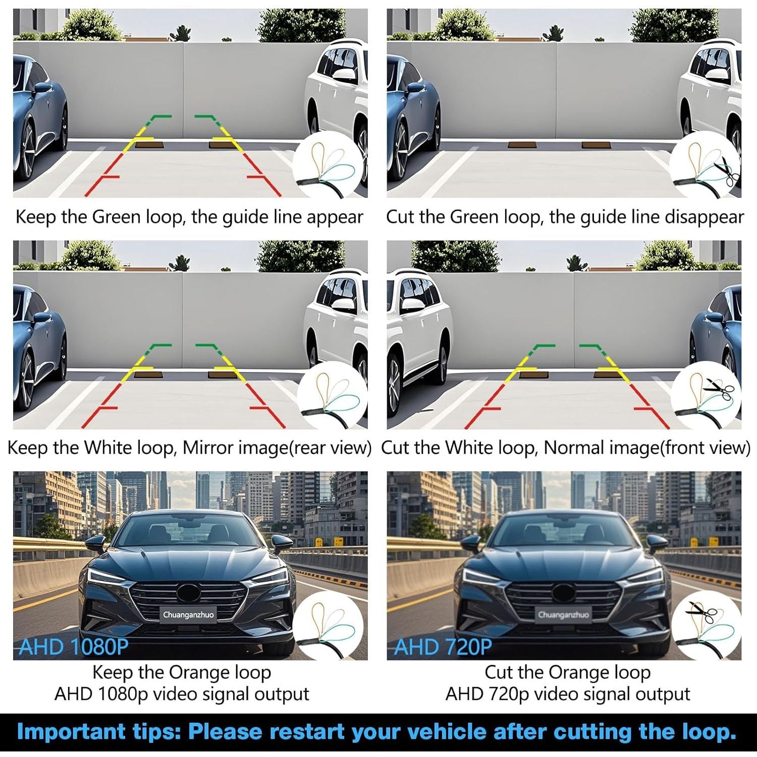 - 【Support AHD 1080P and AHD 720P switching】This backup camera supports seamless switching between AHD 1080P and AHD 720P resolutions. By default, it outputs an AHD 1080P signal to enable 1080P display (provided the connected screen supports AHD 1080P). If your head unit only supports AHD 720P, please cut the orange wire loop to adjust the camera to output an AHD 720P video signal.
