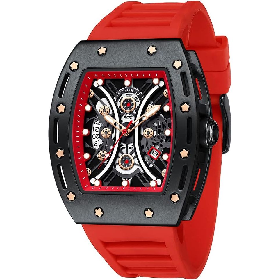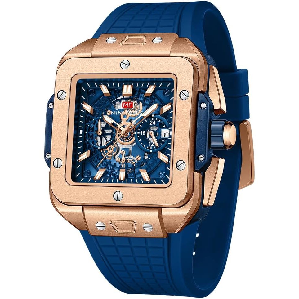 Unique design large dial fashion square watches skeleton design, japanese quartz movement and battery ensure accurate timing and long service time. Quality materials design the watch case is polished by IP plasma plating process, which makes the watch much harder. 316L Japanese stainless steel is commonly used for aviation parts and scalpels, which is corrosion resistant and anti-allergic, so you can wear the watch with peace of mind. Military rubber strap : made of imported military rubber, the strap is soft, comfortable and breathable, bringing you a different kind of comfortable experience. Japanese quartz movement: Precision quartz movement from Japan, accurate timekeeping and stable condition, bringing you a convenient experience! Ergonomic design: The watch is ergonomically designed with a double curved bridge to make it fit your wrist better. The mens wrist watch uses Super-Luminova, a grade A luminous material. If this material absorbs enough light, it will last for at least 4 hours green in a dark environment. The intensity and duration of the luminosity depends on the light absorbed. 30M WATERPROOF This AIMES water resistant men's watch is perfectly resistant to accidental splashed water such as rain or sweat. There is no need to remove the watch when washing your hands, washing your car or swimming in the shallow end. Please note that all water resistant watches are not suitable for use in hot situations such as showers, baths and saunas. High temperatures will cause water droplets to seep into the watch, rendering it waterlogged and unusable. Item Specification: Band material: Silicone Strap Case diameter: 1.65 inch / 41.8 mm - Case thickness: 0.66 inch / 16.7 mm - Band width: 1 inch / 26 mm - Max wear length: 9.4 inches / 24 cm - Product weight: 99g / 3.5oz What is in the package: 1 *Mens Military Watch 1 * English Instruction 1 * Watch Box