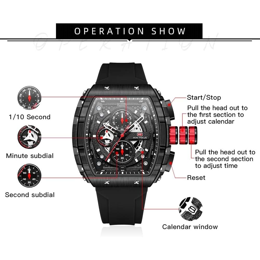 - Multi-function: Six-hand Multi-function chronograph Quartz Movement ,Three Chronograph Sub-dial,1/10 Sec Sub-dial, Seconds sub-dial, Minute Sub-dial.