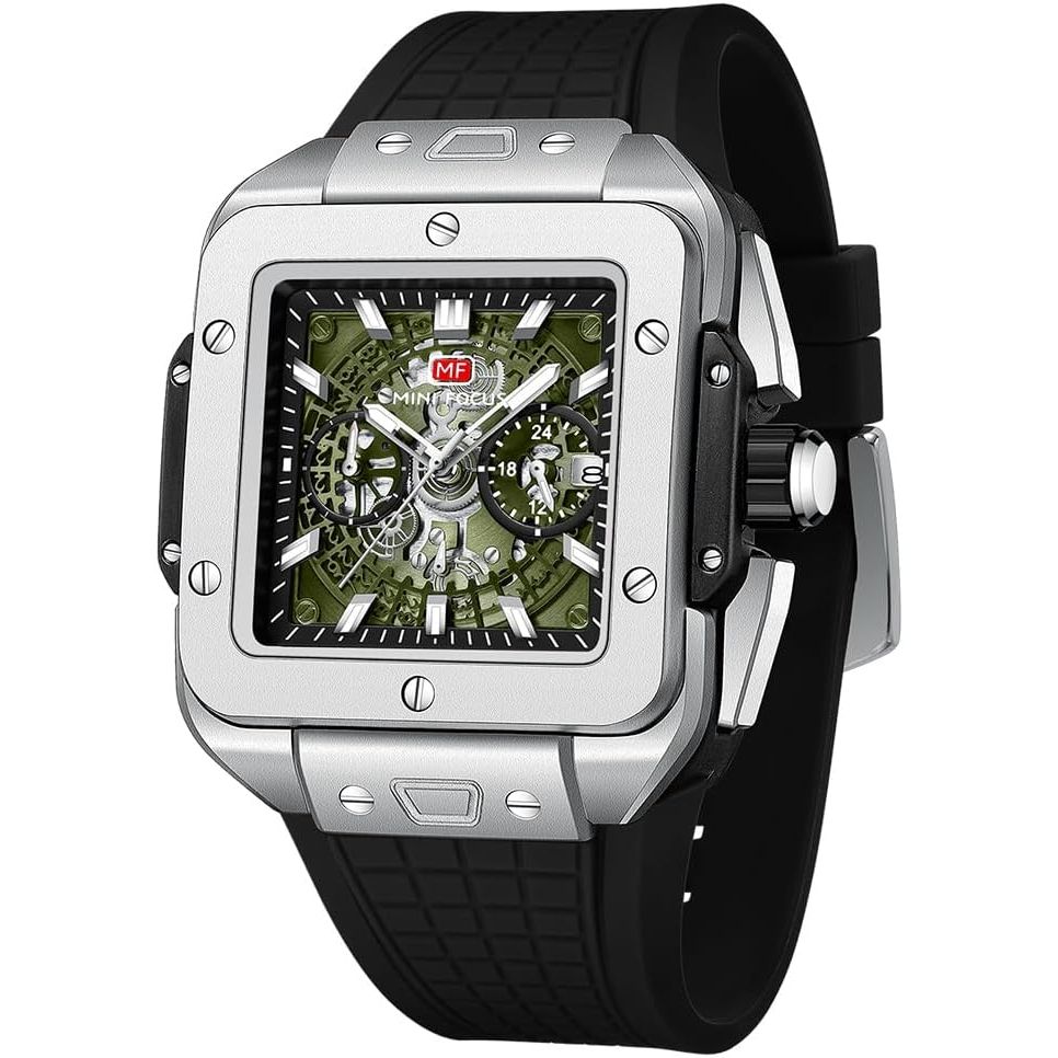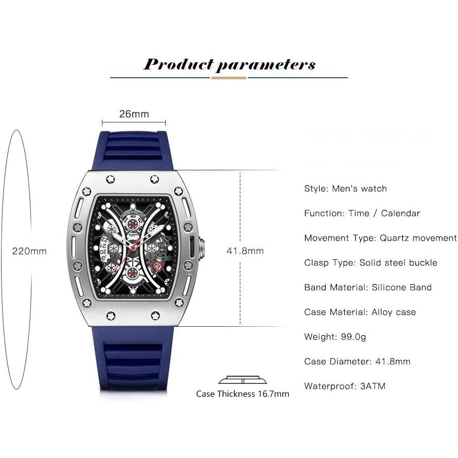 Unique design large dial fashion square watches skeleton design, japanese quartz movement and battery ensure accurate timing and long service time. Quality materials design the watch case is polished by IP plasma plating process, which makes the watch much harder. 316L Japanese stainless steel is commonly used for aviation parts and scalpels, which is corrosion resistant and anti-allergic, so you can wear the watch with peace of mind. Military rubber strap : made of imported military rubber, the strap is soft, comfortable and breathable, bringing you a different kind of comfortable experience. Japanese quartz movement: Precision quartz movement from Japan, accurate timekeeping and stable condition, bringing you a convenient experience! Ergonomic design: The watch is ergonomically designed with a double curved bridge to make it fit your wrist better. The mens wrist watch uses Super-Luminova, a grade A luminous material. If this material absorbs enough light, it will last for at least 4 hours green in a dark environment. The intensity and duration of the luminosity depends on the light absorbed. 30M WATERPROOF This AIMES water resistant men's watch is perfectly resistant to accidental splashed water such as rain or sweat. There is no need to remove the watch when washing your hands, washing your car or swimming in the shallow end. Please note that all water resistant watches are not suitable for use in hot situations such as showers, baths and saunas. High temperatures will cause water droplets to seep into the watch, rendering it waterlogged and unusable. Item Specification: Band material: Silicone Strap Case diameter: 1.65 inch / 41.8 mm - Case thickness: 0.66 inch / 16.7 mm - Band width: 1 inch / 26 mm - Max wear length: 9.4 inches / 24 cm - Product weight: 99g / 3.5oz What is in the package: 1 *Mens Military Watch 1 * English Instruction 1 * Watch Box