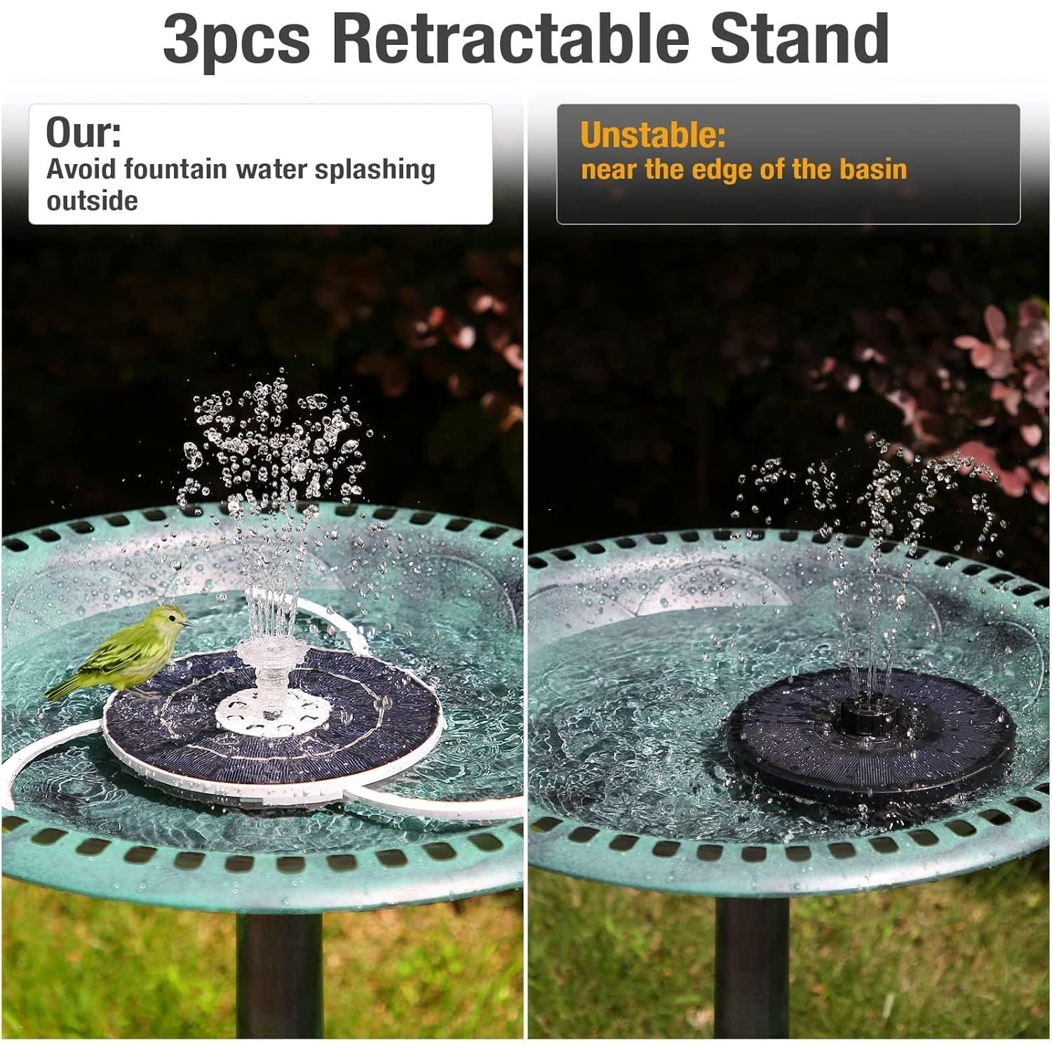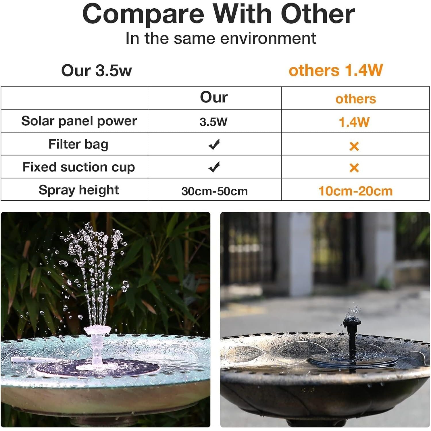 - [High Efficient Solar Fountain]: This water fountain has a power of 3.5w and can work quickly. In the sun, the spray height can reach 100cm. And the performance is stable, the exclusive fixer designed by our company can avoid the solar fountain from moving randomly. It can prevent the fountain spraying the water outside of the bath and empty the water quickly. No need to waste time and water anymore.
